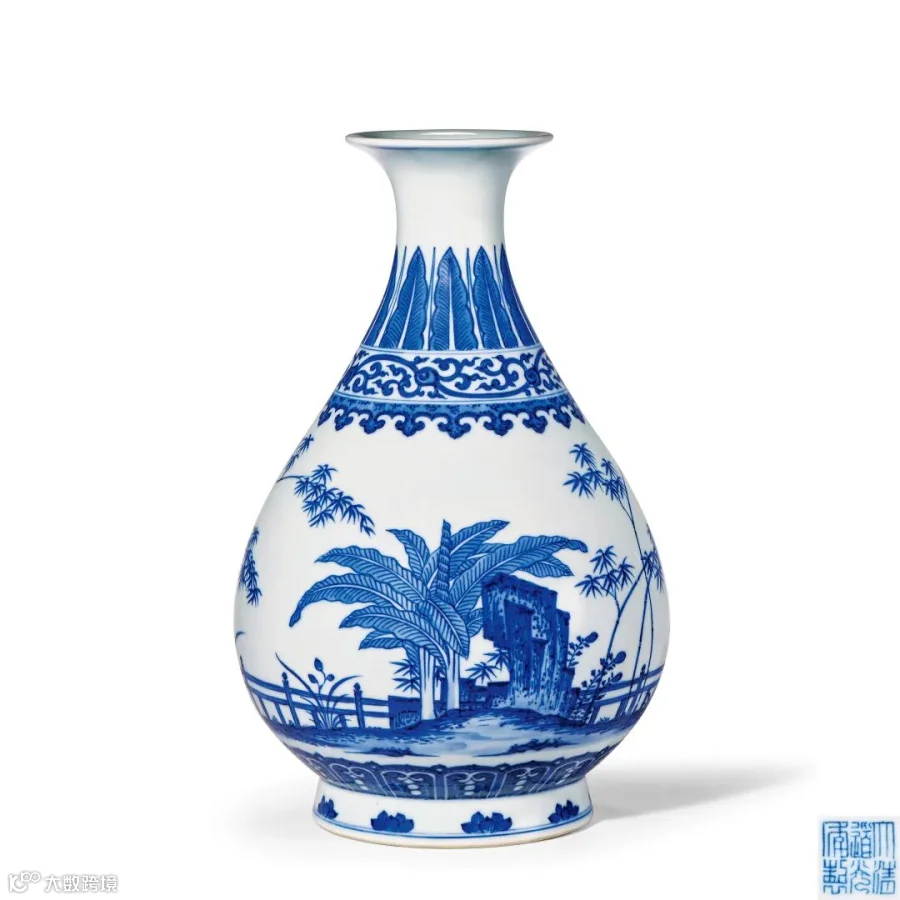 此瓶撇口,细颈,颈部中央微微收束,颈部向下逐渐加宽过渡为杏圆状下垂腹,是为典型之玉壶春瓶造型。瓶外壁通体以青花为饰,青花色泽稳定,色调雅致清丽。腹部饰青花芭蕉竹石图案,栏杆环围,芭蕉和兰竹生于奇峻洞石之间,静谧宁和,生机盎然,给人以水墨小品画般清幽之境,别有趣味。制瓷工匠笔意娴熟,构图疏朗得当,纹饰布局富有层次,画工纤巧,为道光青花的代表作品。