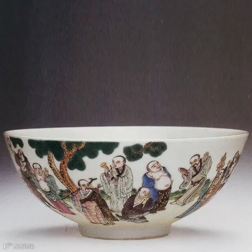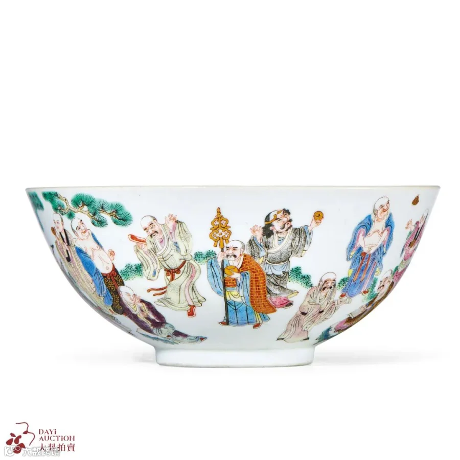 拍品敞口、弧腹、圈足,造型典雅,胎釉洁净细润,外壁通景绘十八罗汉图,衬以山石树木、楼台亭桥,构图疏密有致,画工精准传神,粉彩加金彩绘饰造就明艳华美之韵、富丽堂皇之象,十八罗汉身姿神态各异,气氛欢愉,栩栩如生,呼之欲出,实为清中期难得一见的彩瓷佳器,殊堪宝藏。