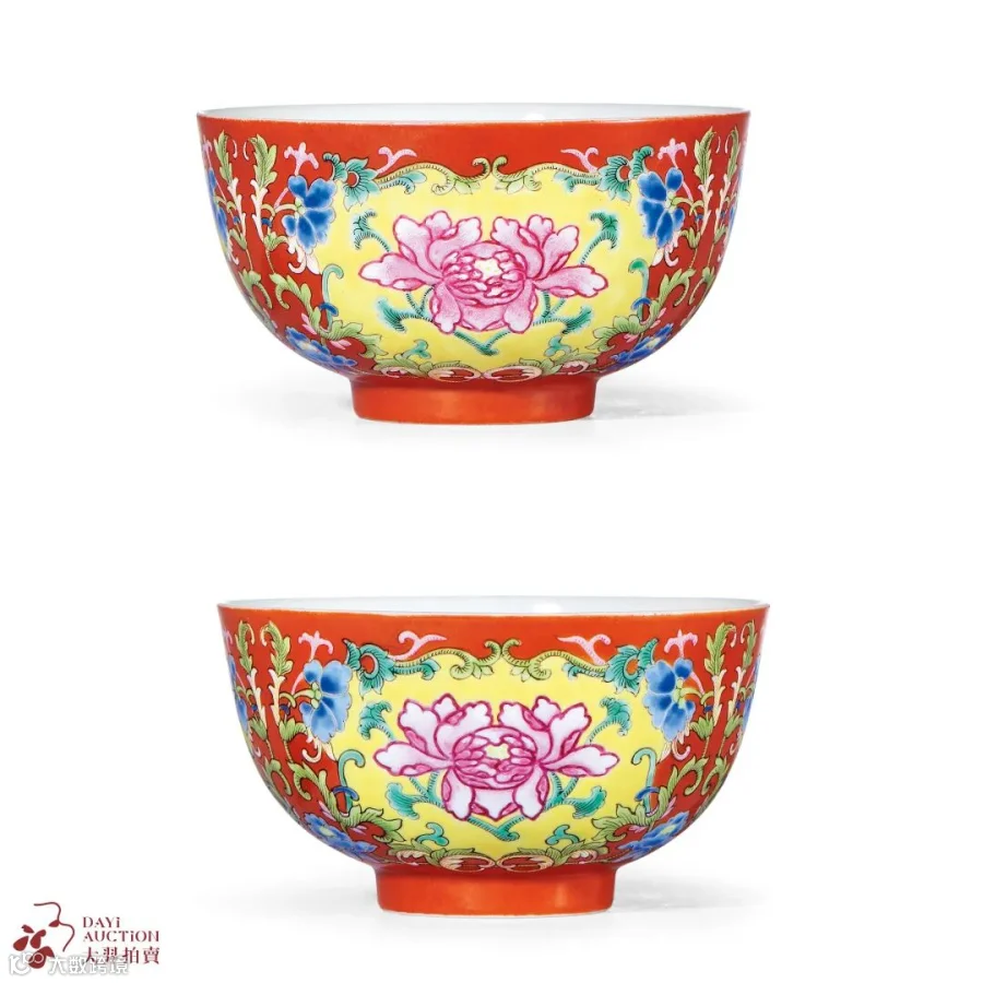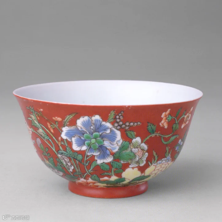 清道光 珊瑚红地洋彩开光花卉纹碗一对在纹饰绘制上也借鉴了西洋技法,而又以传统牡丹花卉作为主题纹饰,中西合璧,完美地把西方优秀绘画技法与中国式审美品位相结合。