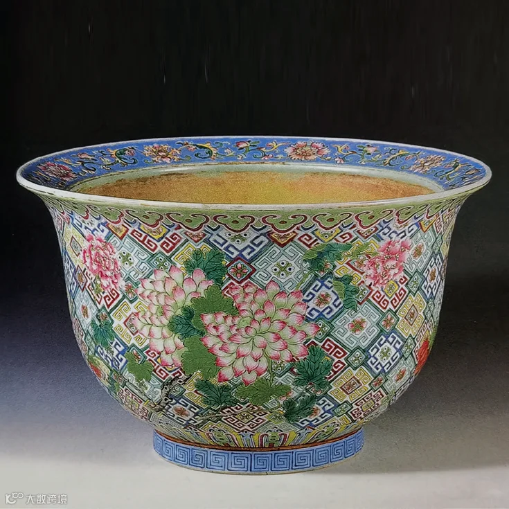 清宫花盆式样丰富,材质多样,尤以康雍乾三朝制作为盛,参考清宫陈设档和宫廷绘画作品可知,不同材质的花盆使用功能不一,存在明确的分工。瓷质花盆则是实用器皿,主要供后寝生活区与京郊各处皇家园林使用。因此,瓷质花盆也有室内与户外之别,从而影响到花盆的形制设计。室内者以尺幅小巧者居多,养植只适合室内生长的观赏植物,而户外养植则盆相对尺寸较大,拍品为前者,南京故宫博物院也藏有类似拍品。