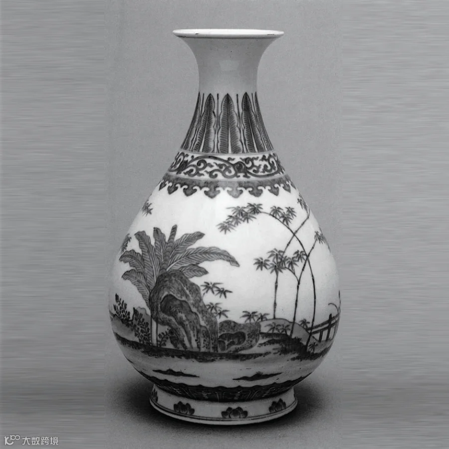此件玉壶春瓶的造型是由唐代寺院里的净水瓶演变而来。元代始有青花品种出现,至明初永宣时期有绘青花竹石芭蕉图者,成为后世官窑青花同类器之范本,至清代更成为传统官窑,每朝均有烧造。