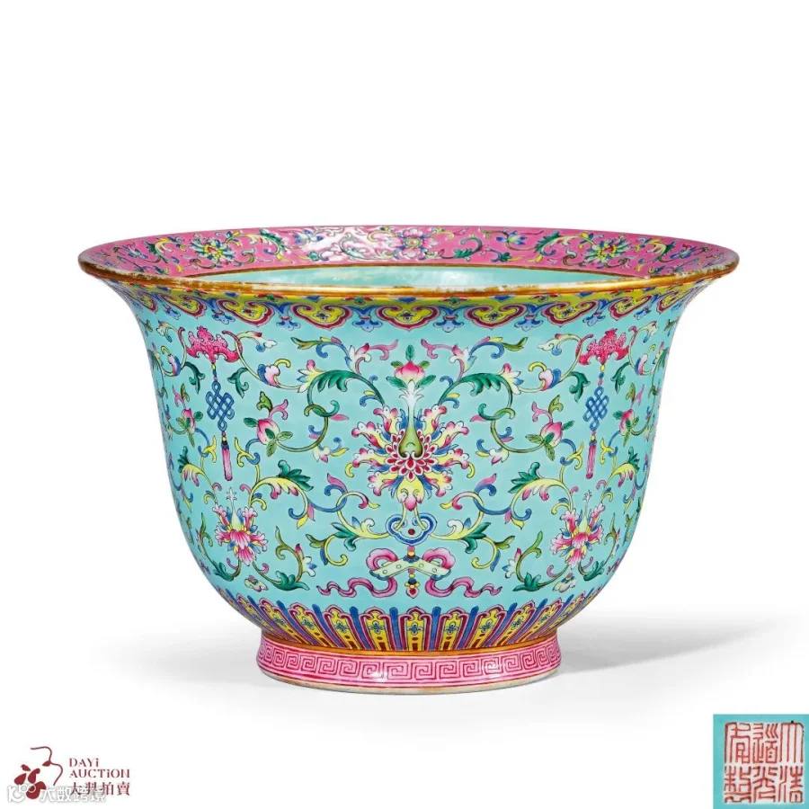 其敞口,深弧腹,圈足。口沿描金,口沿内侧饰以粉地缠枝花卉纹,口沿外侧饰一圈粉彩如意云头纹。器身主体以松石绿为地,其上绘缠枝莲纹,莲花枝蔓勾描细腻,舒卷自如,花瓣处施彩厚实,笔触细腻,质感强烈,极富立体感。莲花之间穿插折腰磬、盘长结与蝙蝠,利用蝠、磬、莲花三者的谐音,构成“福庆连连”的吉祥寓意。