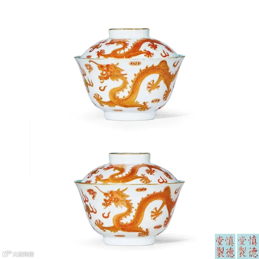 盖碗身及盖面均饰矾红描金双龙戏珠纹,矾红施彩均匀,金彩颜色艳丽,暗刻的海浪细腻,层次分明。游龙于波涛汹涌的海浪之上,追云赶珠,龙身矫健,龙爪锋利,虽不及雍干龙纹威猛,也别有一番憨态可掬之韵味。整体描绘精细,具有鲜明的宫廷艺术特点,工艺精湛,成对骈出,较为难得。