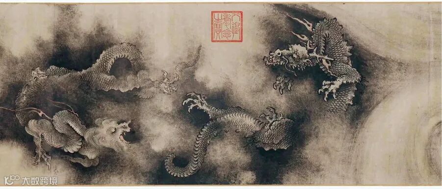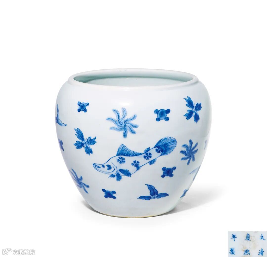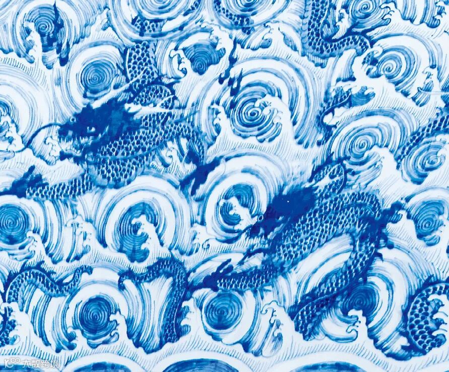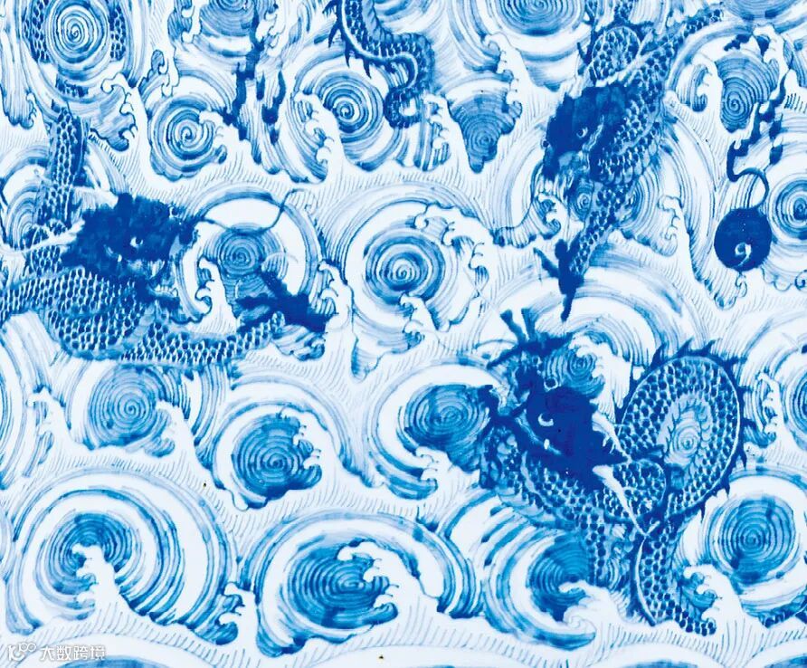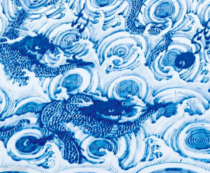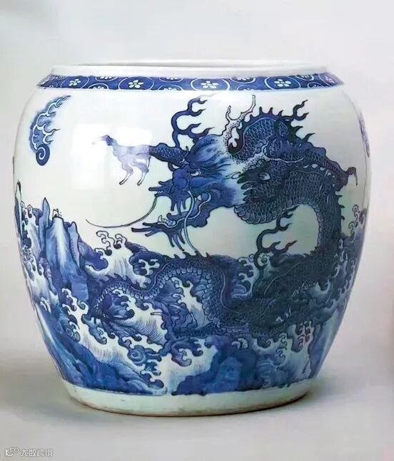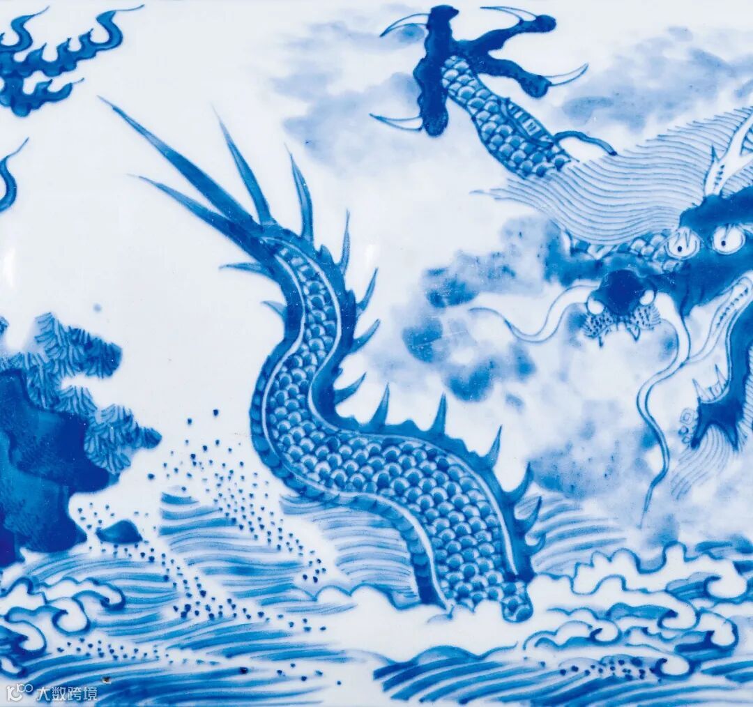 本品九龙形象与南宋画家陈容所绘《九龙图》在形象上极为相似,九龙追逐嬉戏于白浪苍茫间,极尽腾挪变化之态。用笔均豪纵雄健,迸发出龙的无穷变化之神力。而能烧制此种尺寸之大龙缸,非龙缸窑莫属。清初,龙缸屡屡烧制不利。康熙十年的《浮梁县志》载:“国朝顺治十一年,奉旨烧造龙缸,径围三尺五寸,墙厚三寸,底厚五寸,高二尺三寸,每烧出窑,或塌或裂,自十一年起至十四年,缸造二百余口,无一成品。”也可见龙缸烧造难度之高,直至康熙时期御窑厂重建,龙缸才得复烧成功。本品即为康熙朝御窑重建后制出作品。