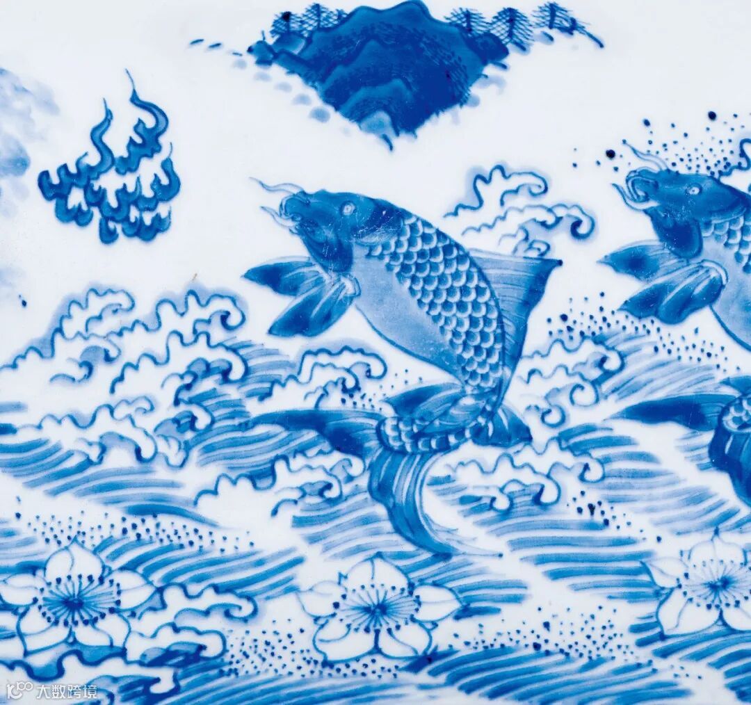 另有一类吉祥龙纹题材,亦现风采,拍品编号53清早期青花云龙三现图案缸,为文人题材,“鲤鱼跳龙门”,一跃成名,吉意呼之欲出。此时期龙纹四爪三爪多见,五爪反而少见,可见当时宫廷还是天朝心态,少清规戒律,多宽松随意。本品敛口,圆腹,圈足,造型饱满。器身以青花绘鱼化龙纹,鲤鱼身形丰盈,奋力跃出,龙纹飘逸,栩栩如生;纹饰清晰流畅,青花浓艳,极具时代特征。