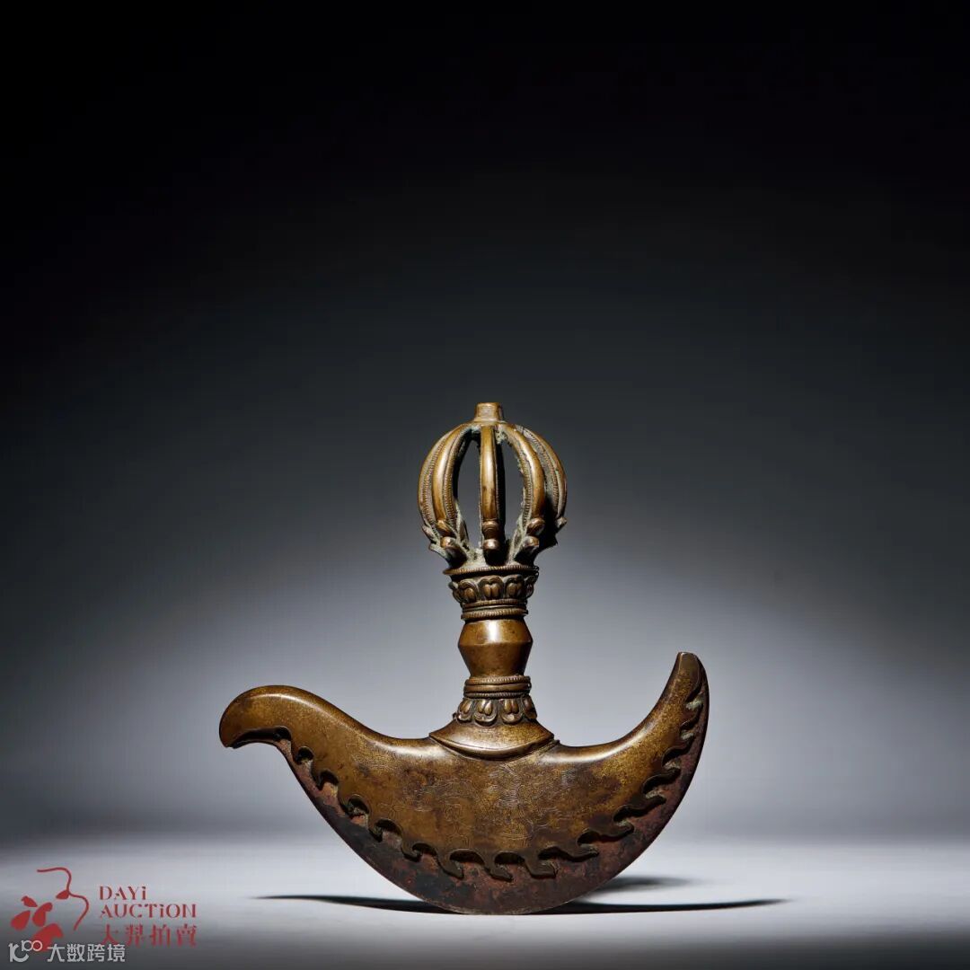 此件金刚钺刀顶端为九股金刚杵,中股顶端为圆柱体,下端为八棱状,对应着八支协股。向下为宝瓶状刀柄,两端饰有仰覆式莲瓣。最下方的斧形刀口,精铁所铸,历经数百年而不朽。整器内敛而深沉,符合金刚钺刀在藏传佛教中斩断一切除贪、嗔、痴、慢、疑、恶见等六种根本烦恼之意。
