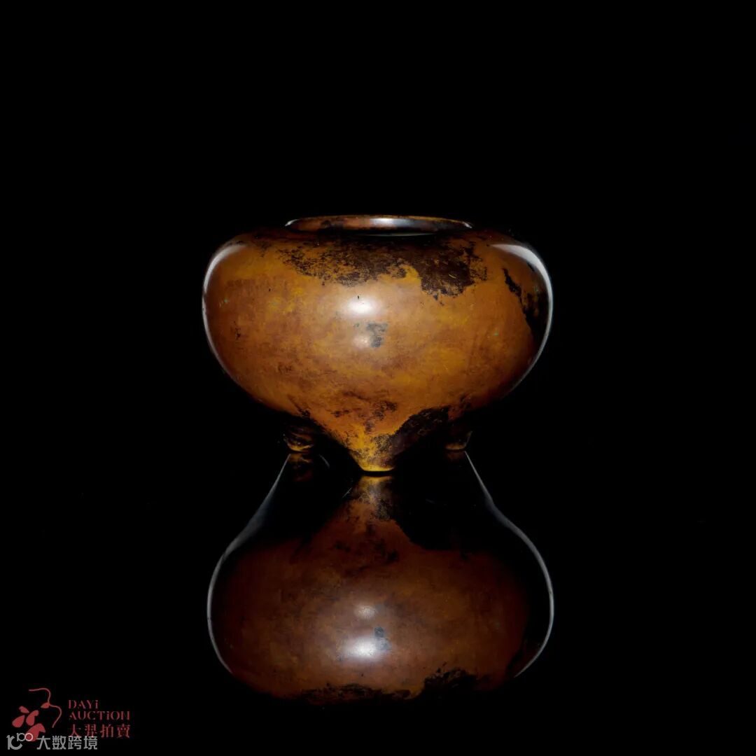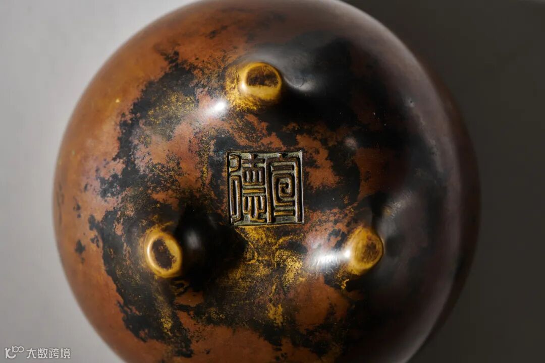 此炉以精铜铸就,器壁厚实,手头极佳,扣之有嘤嘤之声不绝于耳,可鉴铜质极佳。炉形古朴,炉体作钵之样式,唇口束颈,腹部饱满圆润,下出三如意纹乳足,造型特殊,不为多见。炉底部长方形开光内,减地铸刻“宣德”二字篆书款。