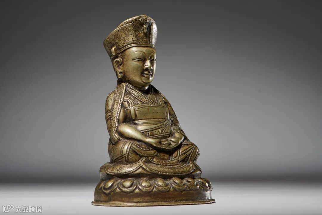 上师造像是藏传佛教体系特有的,极为特殊的造像题材。后弘期教派林立的宗教局面,使得上师造像艺术在西藏形成了极其庞大的体系。由于上师是现实中的人物,因此以上师为题材的作品通常是极具写实性的雕塑作品。此尊上师面容刻画写实,额间的皱纹,含笑的嘴角和脸部肌肉线条都刻画得相当真实;头戴法帽,身着法衣袈裟,双手结禅定印,双腿结跏趺坐于台座上。整像权衡合度,生动写实,反映了十六世纪西藏肖像题材的特点。