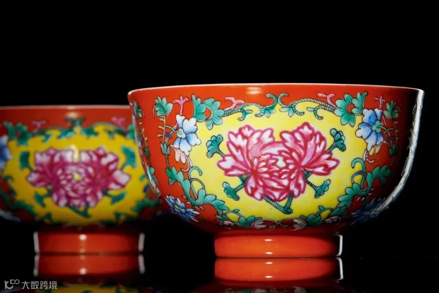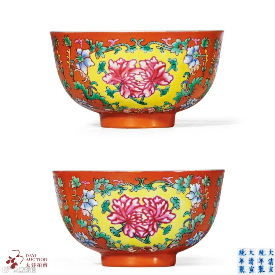 拍品深腹,弧壁,敞口,圈足,小巧精致,轻盈秀美。碗内壁施白釉,釉面匀净,釉汁润泽;外壁以珊瑚红彩为地,结合西洋洛可可风格的缠枝花蔓围成三组开光,内绘黄地粉彩牡丹纹。色彩艳丽的珊瑚红、秀美娇妍的牡丹与匀净细腻的粉彩底色之间形成强烈的视觉对比,画面华丽,宫廷气息浓郁,实为宣统粉彩器的精品。北京故宫博物院藏一件康熙款并饰同样纹饰的珐琅彩碗,由此可推本品应为宣统官窑承袭旧式所致,可作参考。