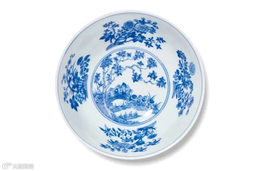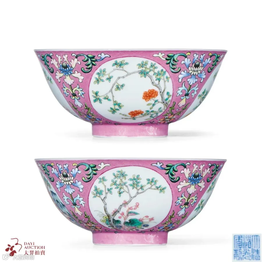 除却祭器,我们也从道光时期节令膳碗中看到,无论是制作工艺,还是满满的时节仪式,道光皇帝都有好好的延续父辈的文化内涵。此中节令膳碗具有浓郁的节令特征,对应相应的节令使用,此式碗均采用外壁以色地轧道为地,开光内以洋彩装饰,碗内壁则以青花为饰,内外壁纹饰相互呼应,技法繁复,一直以来被认为是最能体现道光一朝制瓷技艺的御窑佳器。