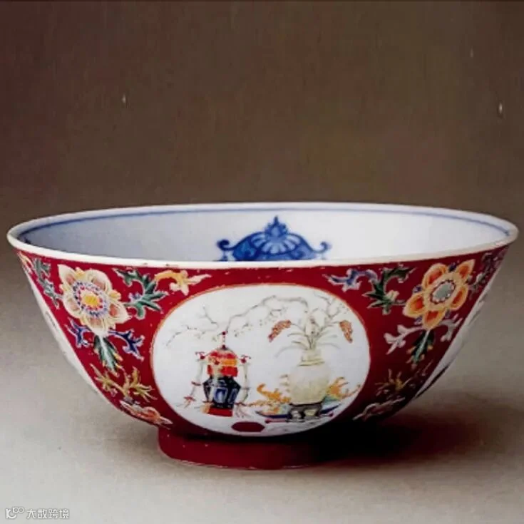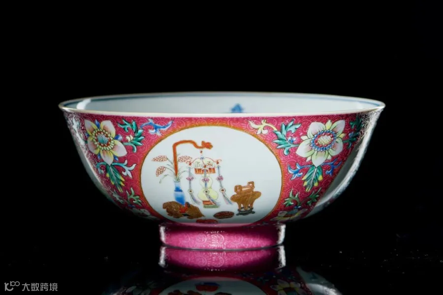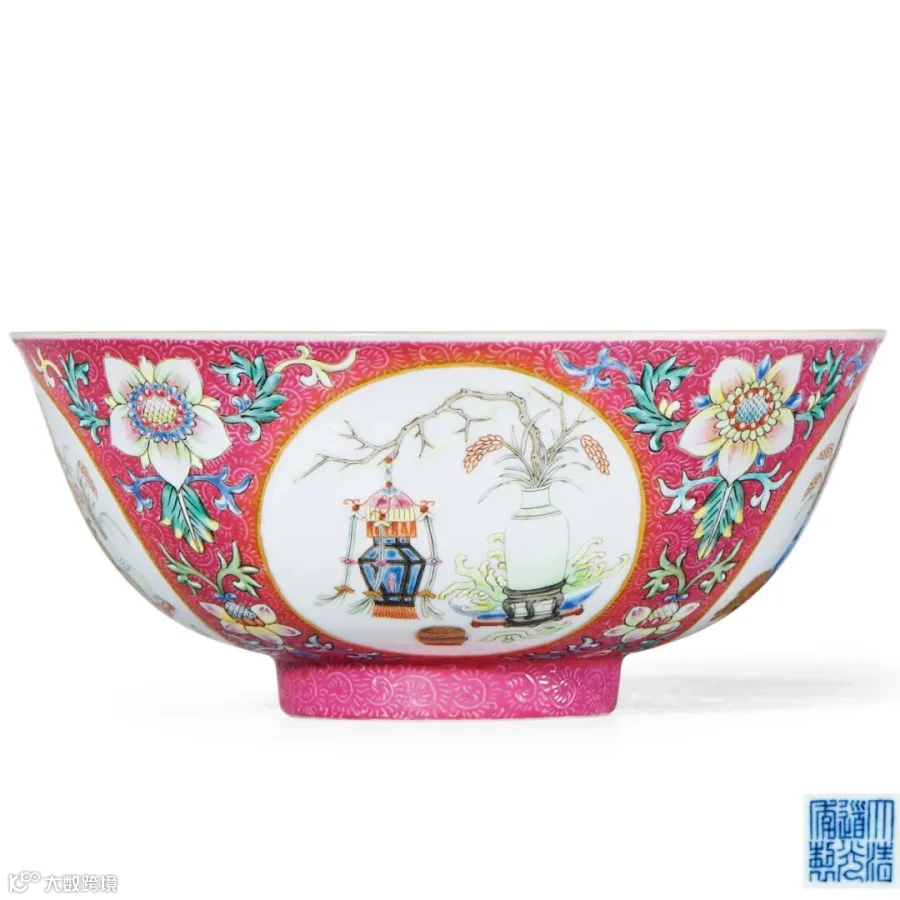 另一件拍品LOT26清道光 胭脂红地轧道开光洋彩五谷丰登纹碗相同的制式,外壁胭脂红地,四开光内分别绘各式瓶、灯笼及盒、香炉、如意、磬、花插、双扣金钏、带扣、佛手、桃等文房清供,瓶中插有麦穗。开光之间均绘上大下小两株洋莲,上为正视状,下为侧视状。内壁等距绘四个不同样式的灯笼,碗心青花双圈内绘八方图案纹样,正向四面出盆花、麦穗,斜向四面出灵芝头、花蝶,整体呈对称排列。内外皆绘的麦穗代表丰收的谷物,与灯笼相组合,寓意五谷丰登。