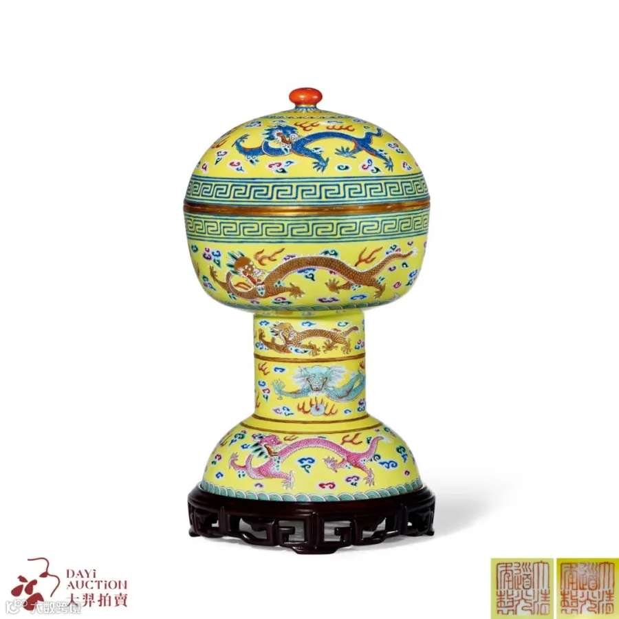 也可从《皇朝礼器图式》记载中得知,乾隆十三年(1748年)钦定瓷登祭器,其中仿古青铜器纹瓷登以黄、蓝、红、月白、白五色用于地坛、天坛、日坛、月坛、先农坛及太岁坛等处的祭祀活动。而本拍品则为清代皇帝祭祀祖先之用,造型古朴华丽,工艺精湛,用柠黄地九龙纹以示皇帝身份。