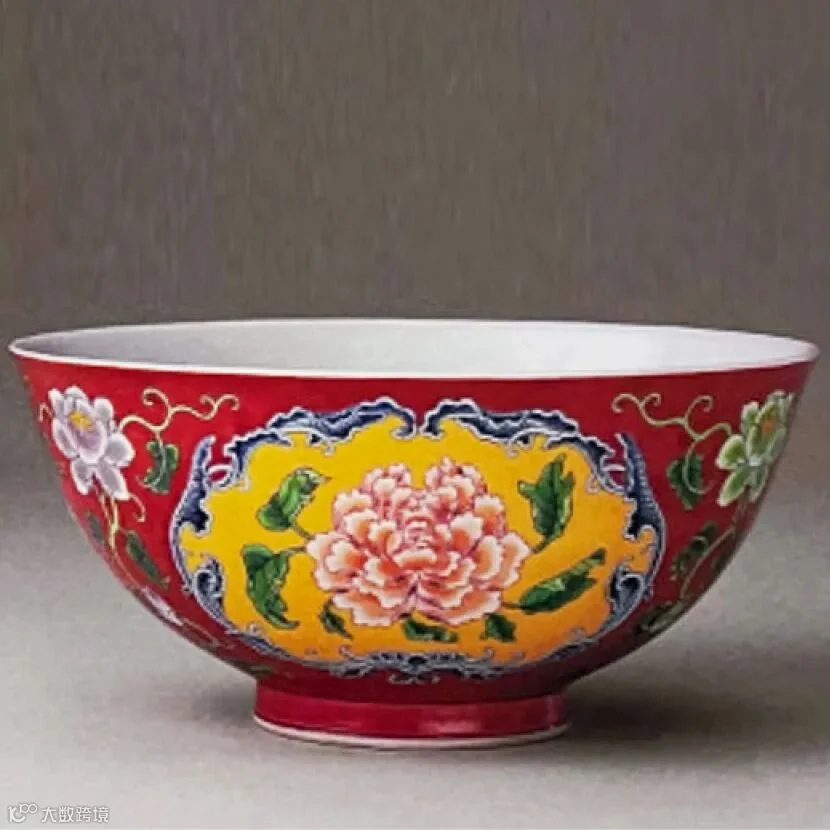 此对清宣统 珊瑚红地洋彩开光花卉纹碗纹饰绘制上借鉴了西洋技法,而又以传统牡丹花卉作为主题纹饰,中西合璧,完美地把西方优秀绘画技法与中国式审美品位相结合,从而融汇出具有独特艺术魅力的瓷器佳品。