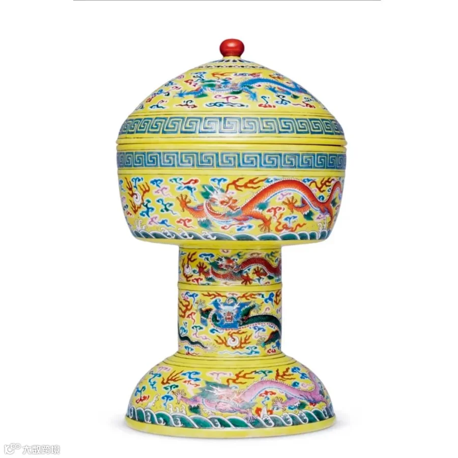 拍品上部半球状碗身,配半球圆盖,顶部以珊瑚红釉饰圆珠盖钮。下以圆粗柱足承托,底部覆盘形足,外形与豆相似。登原为中国古代贵族宴享时盛放太羹(又称大羹,即素味肉汤)的器皿,后发展为祭祀用礼器。《礼记·祭统》注:“登,豆下跗也。”《尔雅·释器》:“木豆谓之豆,竹豆谓之笾,瓦豆谓之登”。北宋聂崇义《三礼图》曰:“以其盛湆,故有盖。”豆和登主要不同在于盖钮不同,豆为绚钮(即绳钮),登为圆钮。