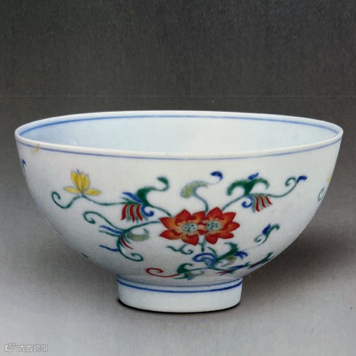 此式斗彩并蒂莲纹碗为清代官窑经典品种之一,始烧于雍正时期,历朝均有烧造。在《雍正、乾隆官窑督陶大事记》中记载乾隆三年(1738年)烧造用于饮茶的「五彩并蒂莲茶碗」,即指此类作品。