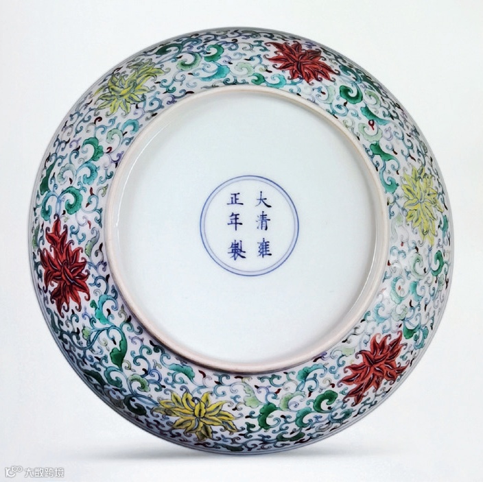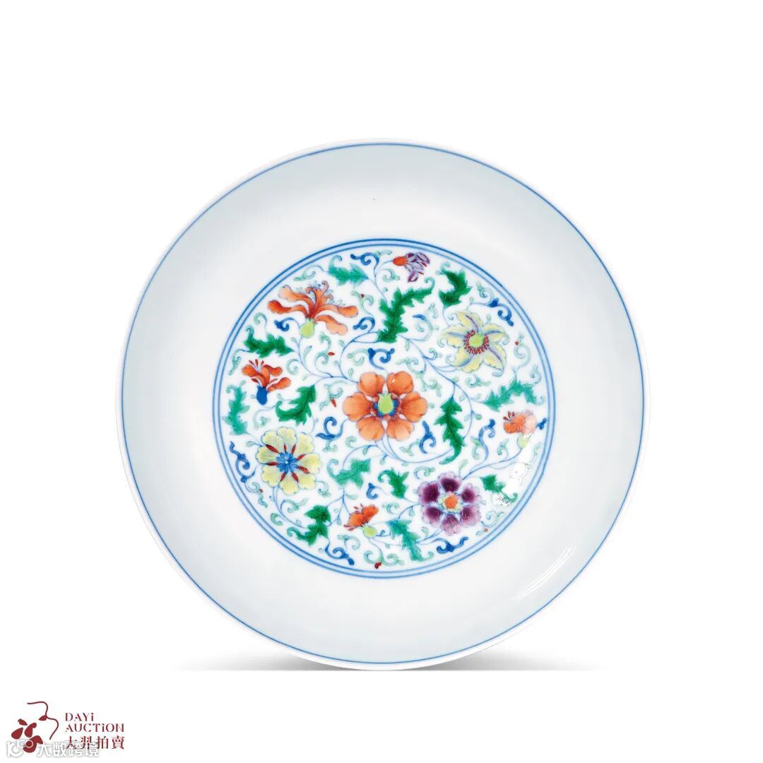 LOT224清雍正 斗彩缠枝花卉纹盘外壁和盘心以斗彩绘缠枝花卉纹,青花勾勒枝蔓,彩料填绘花叶。全器画工流畅,设色细分阴阳浓淡,富立体感,更采用珍贵的胭脂紫、蛋黄釉,衬以温润匀细的胎釉,尤显非凡丽质,为雍正官窑斗彩器之精品。