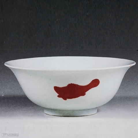 本品胎细腻滋润,釉晶莹透亮,釉里红呈色鲜艳。碗外壁绘釉里红鳜鱼三尾,寓意“富贵有余”,三鱼为传统吉祥图案,其典故出自《后汉书·杨震列传》。本品曾被仇焱之先生旧藏,并以高价释出于1980年11月25日香港苏富比,仇焱之专场,编号115。