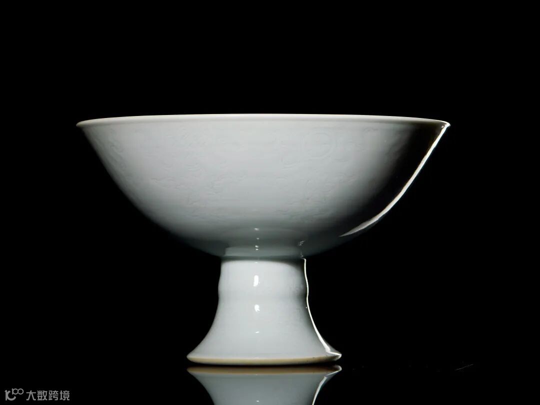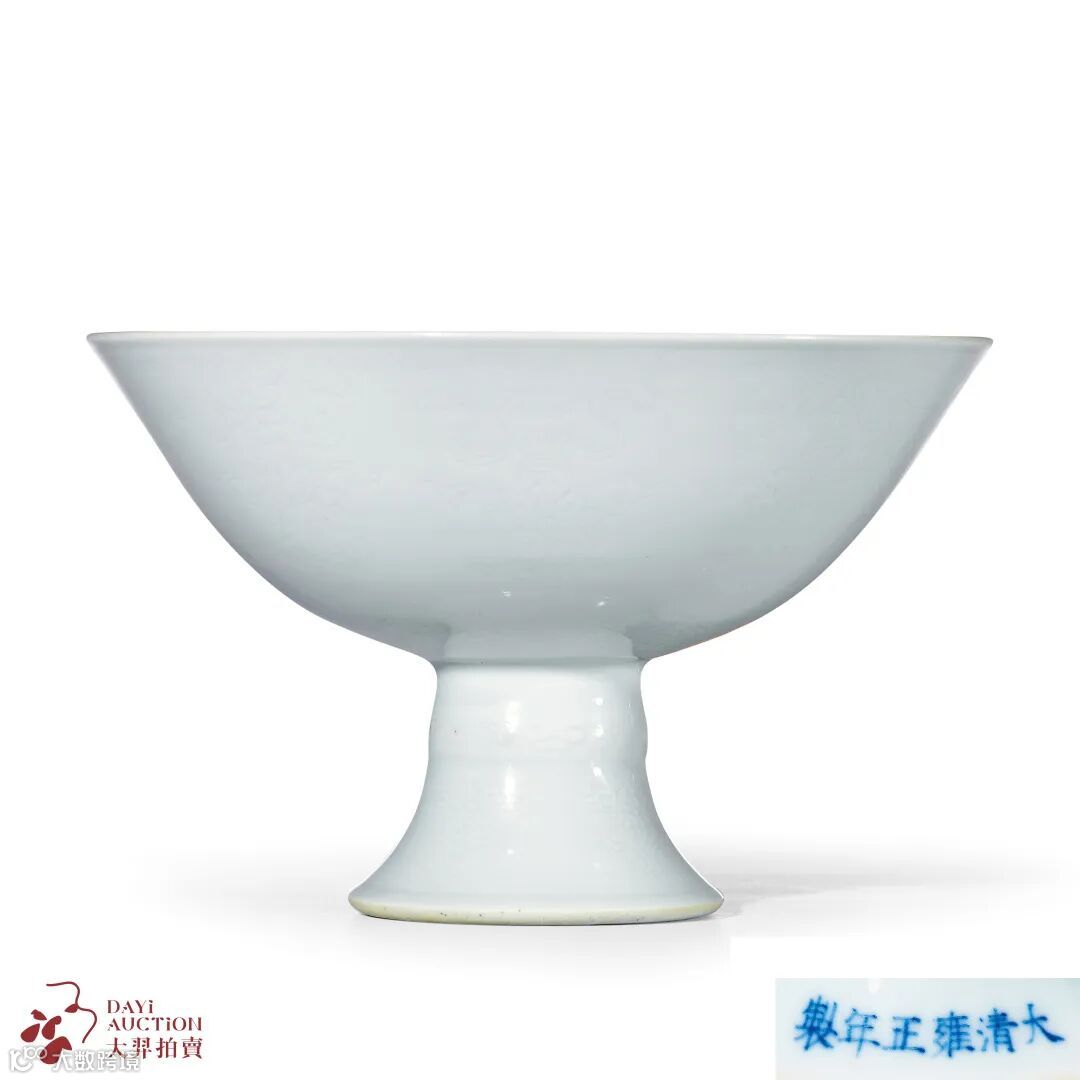 本品器型端庄挺拔,侈口深腹,高圈足,足壁起一道凸棱为饰,此种造型首见于雍正朝。碗壁暗刻折枝莲托八宝纹,近足处饰如意头纹一周,高足分别刻卷草纹、折枝花朵纹、折线纹。纹饰雕刻细腻清晰,为雍正御窑白釉器之佳作。圈足内以青花书“大清雍正年制”六字单行楷书款。