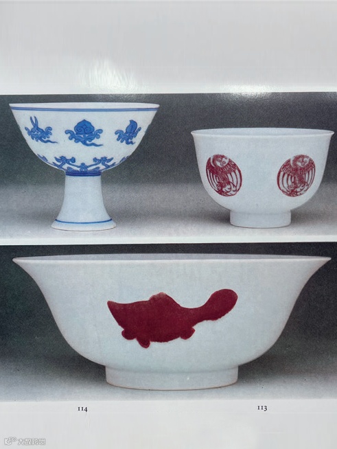 雍正一朝,慕古最佳,精致至极,其白釉之桔皮质感极似宣窑。釉里红三鱼纹更为宣德官窑之至宝【明宣德釉里红三鱼高足碗】,至雍正推崇慕古,大肆仿效。据唐英在雍正十三年撰写的《陶成纪事碑》记载,雍正御窑品种有“一仿宣窑宝烧,有三鱼、三果、三芝、五蝠四种”,即为雍正釉里红三鱼碗之所本。