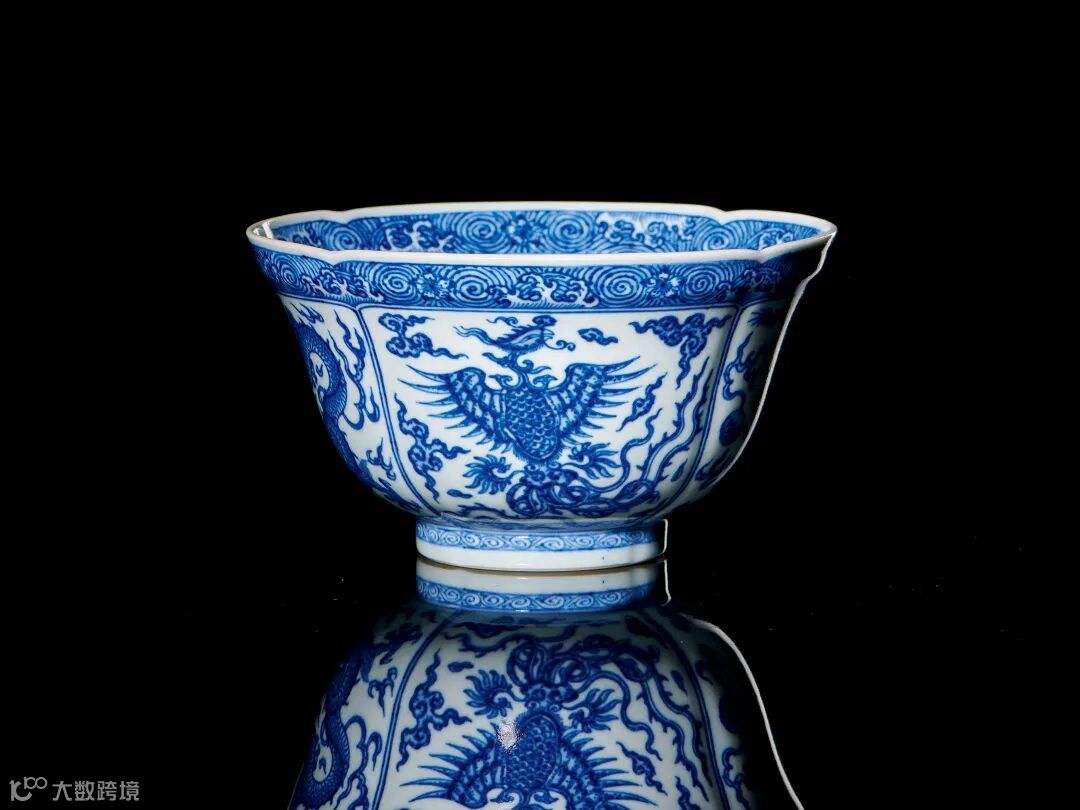 此杯敞口,斜弧腹壁,小圈足,倒置后形似斗笠,故名斗笠杯。杯内口沿处饰一圈青花线,内壁素面,杯心边缘饰双圈青花线,内绘云鹤寿桃纹,寓意吉祥。外壁饰凤穿花纹图,群花妍放,枝叶舒展,双凤翱翔其间,身姿曼妙,典雅高贵。
