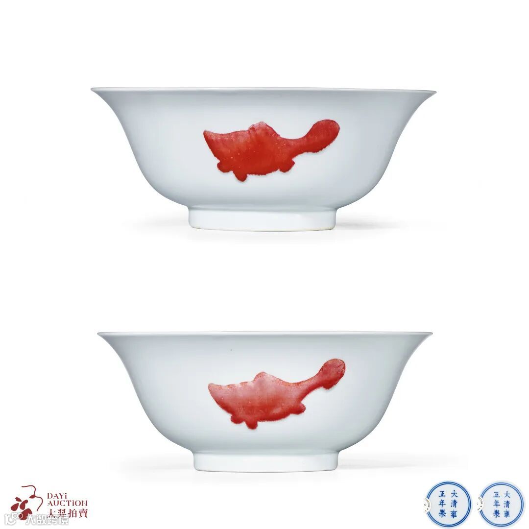 内壁光素无纹,外饰红鱼三条,生动灵活,潜于水中,若隐若现,意蕴朦胧,极具写意之神韵。底足内青花双圈“大清雍正年制”六字双行楷款,成对更是极为难得,颇为珍罕。