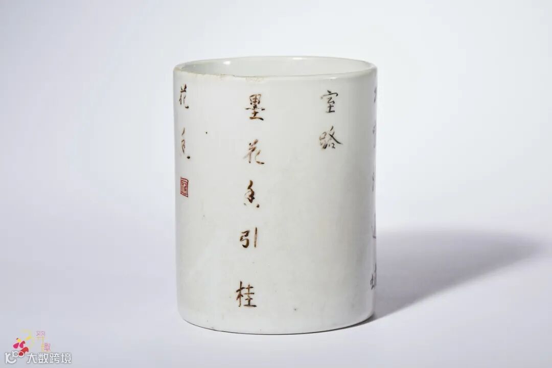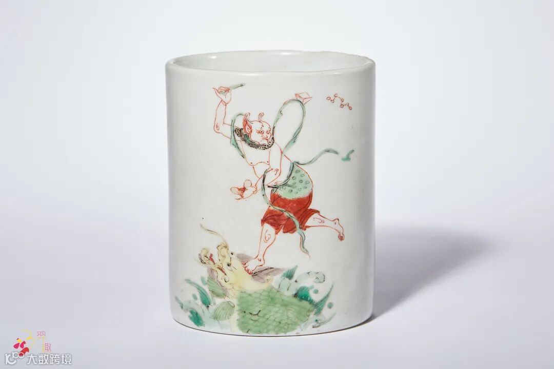 笔筒直口,直腹,造型秀雅。魁星是主文章兴衰的神,此笔筒外壁以五彩绘海水魁星,其一脚向后翘起,一手捧斗,一手执笔,站于鳌首,寓意独占鳌首,展现旧时代文人意在发愤读书,博取功名的情怀,构图空灵,色彩淡雅。