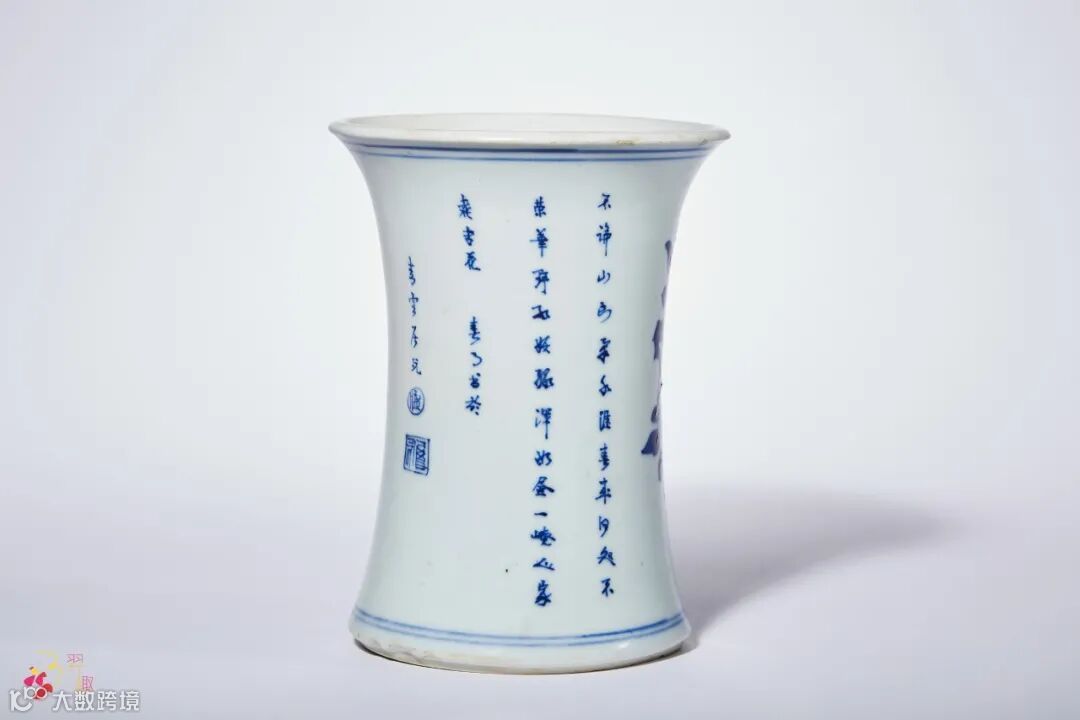 笔筒作束腰形,撇口,腹部内收,足部外撇,胎质细腻,形制规整。器身开光以青花绘人物故事图,线条流畅洒脱,人物衣纹飘逸,青花淡雅素丽,浓淡渲染层次分明,纹饰描绘精细。