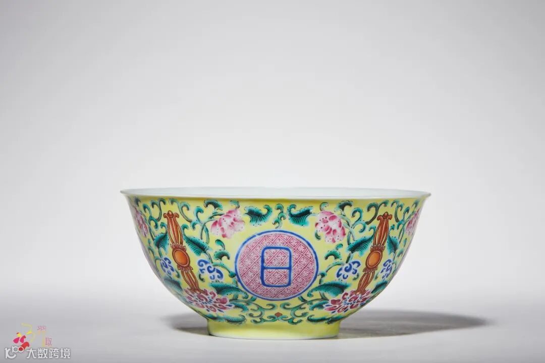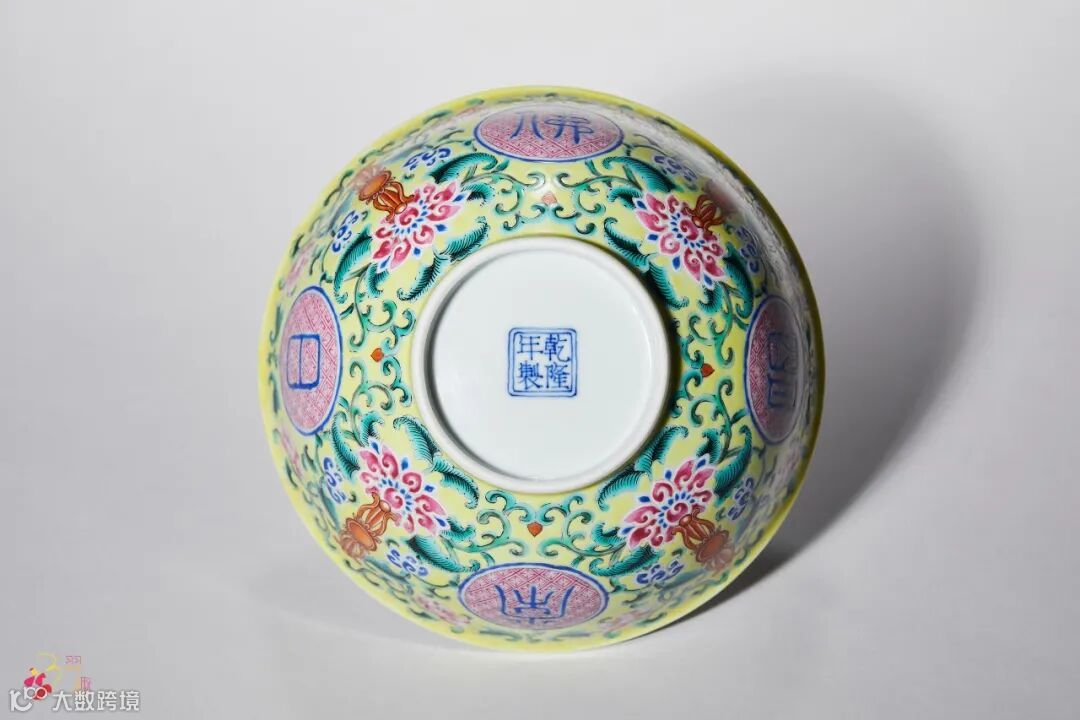 清代皇室崇信藏传佛教,因此佛教元素题材常常运用于宫廷制器上。此式洋彩“佛日常明”碗即是其中典型一例。据清档记载:“乾隆元年十二月二十二日,七品首领萨木哈将碹得画各样花卉木样四件并原样盘二件持进,交太监毛团呈览。奉旨:准照画‘佛日常明’字黄地青番花盘样式作七寸盘、五寸盘,大碗、小碗俱照此花卉样做。钦此。”此式洋彩“佛日常明”碗遂成御用瓷定式,并延续烧制至嘉庆、道光两朝,其后随着清王朝国力日渐衰微,此类洋彩器皿的烧制也逐渐停止。