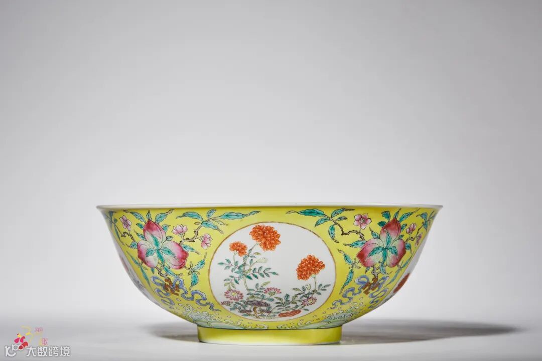 黄地洋彩开光花卉纹大碗 款识:“大清嘉庆年制”六字三行篆书款 直径:22.5 cm. 来源:放山居旧藏(签)