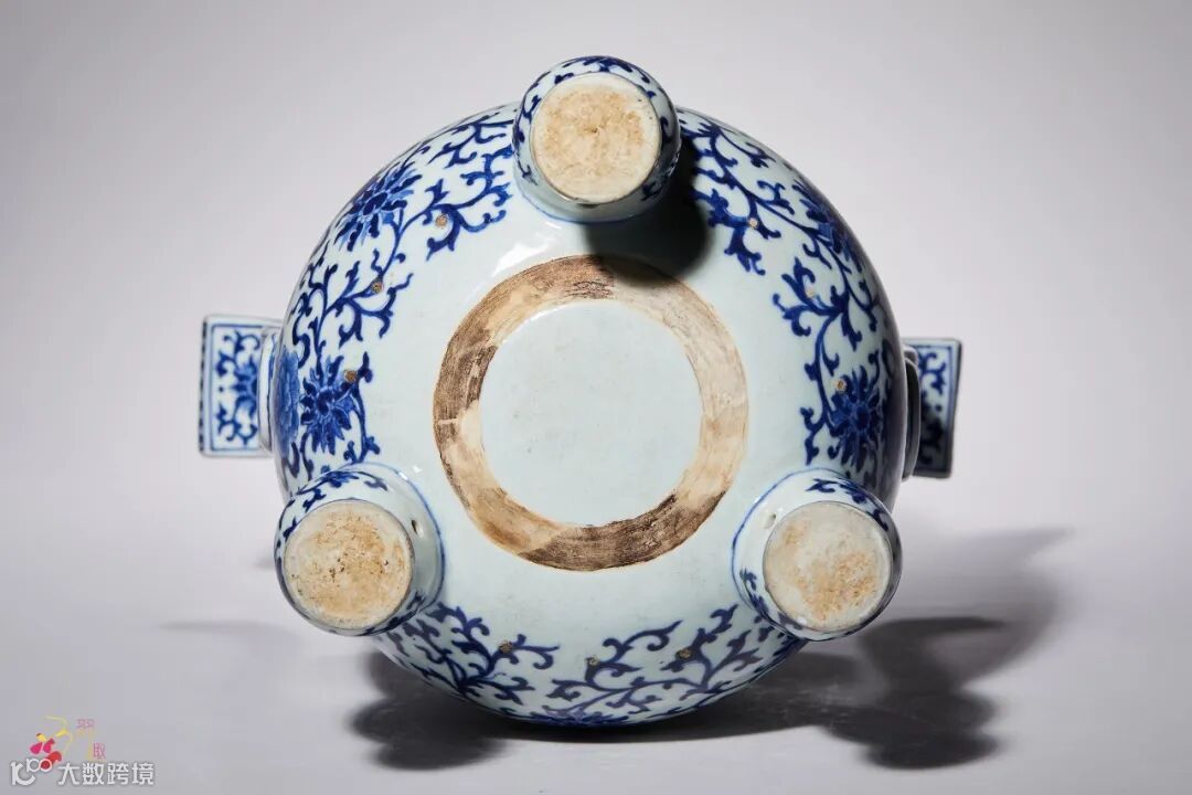 拍品为佛前五供之首,造型敦实,制作工艺精良,其形仿自上古青铜鼎,口沿处饰一周回纹,颈部绘缠枝花卉纹一周,腹外壁精绘缠枝莲纹,马蹄足面亦绘缠枝莲纹,足胫饰回纹一周。全器青花发色明艳,绘画严谨规矩,全器绘工柔和自然,青花发色淡雅。