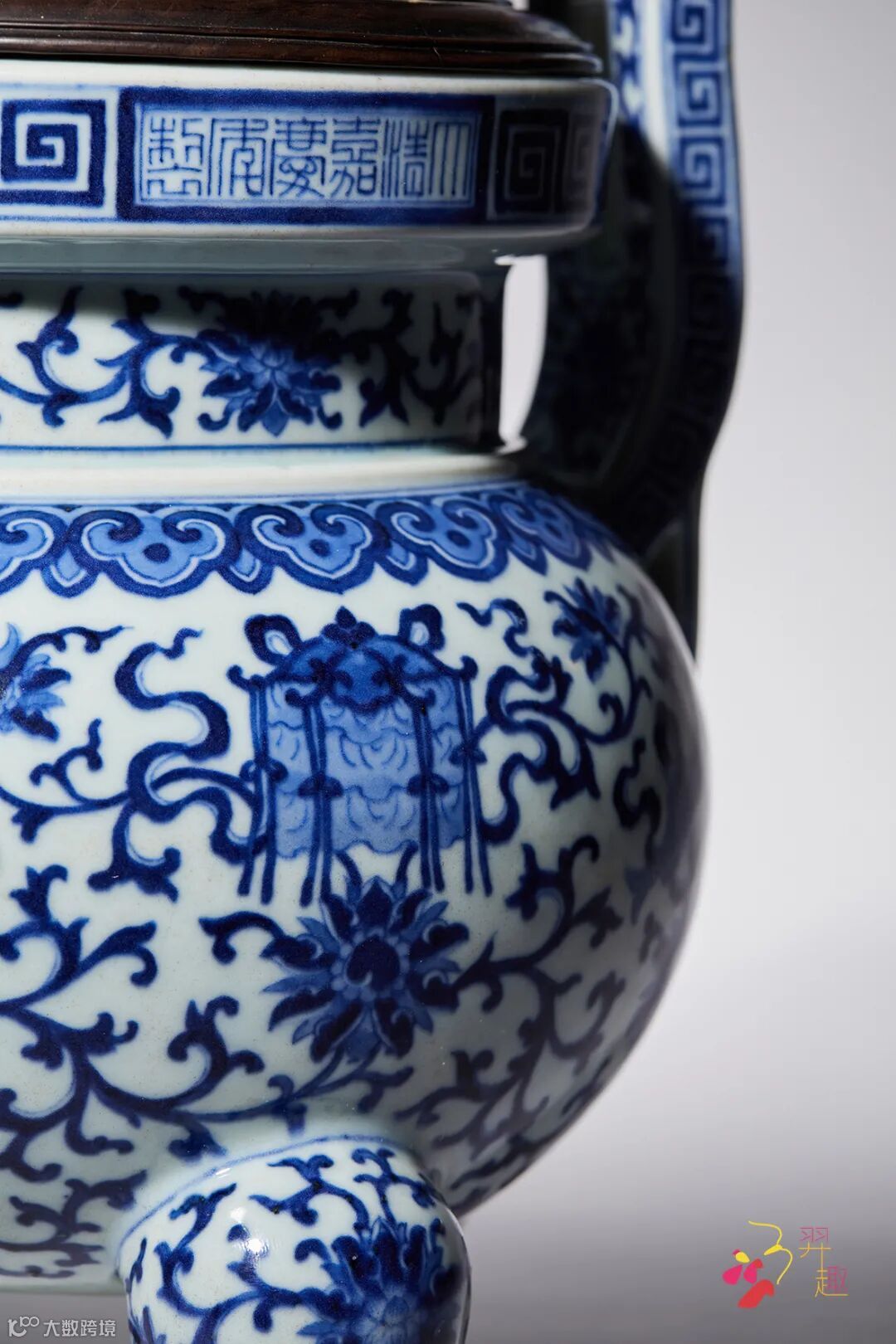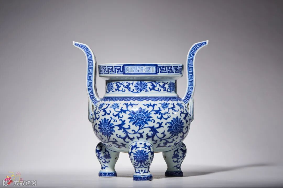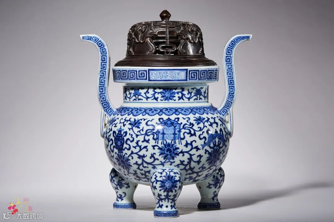 拍品为佛前五供之首,造型敦实,胎体厚重,制作工艺精良,为嘉庆御窑青花精品大器,存世较为少见。其形仿自上古青铜鼎,肩负朝冠双耳,下承三足如鼎。口沿处饰一週回纹,中书横排年款,腹外壁精绘缠枝莲托八宝纹,上有一周如意云头纹垂肩。马蹄足面亦绘缠枝莲纹,足胫饰回纹一周。全器绘工柔和自然,青花发色淡雅,衬以温润白釉为地,堪称美品。《陶雅》一书在记述当时瓷业状况时说的“极精之品,犹自有不可埋没处。”此器即为嘉庆宫廷用瓷中不可多得之作。