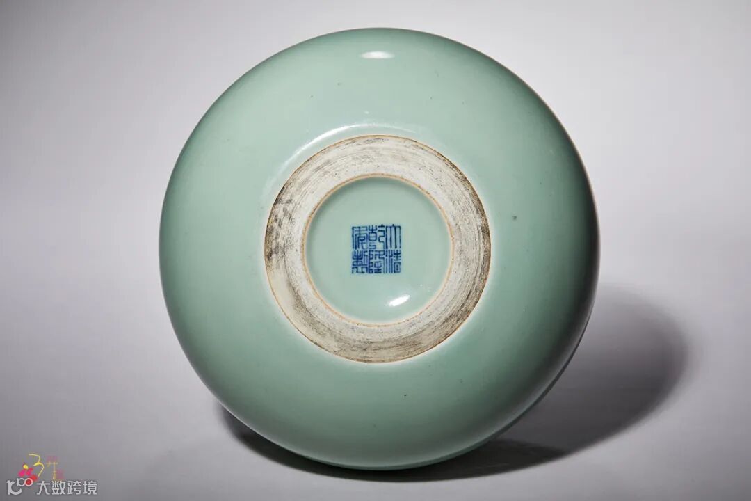 此瓶形制拟取天然葫芦之造型,小口,直颈,卧足,底足为玉璧式无釉,足内则施青釉,体态敦实而优雅。外满施青釉,质地匀净润泽,淡淡绿韵自然清新,沁人心扉。底青花书“大清乾隆年制”六字三行篆书款。