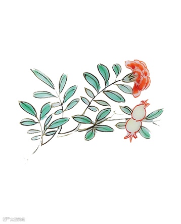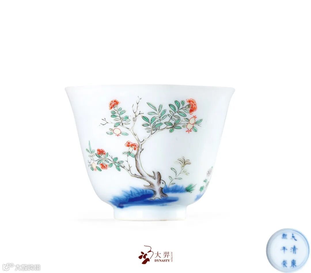 此杯造型小巧灵秀,胎质缜密,轻薄若纸。通体罩施白釉,胎釉结合紧密,坚致纯净。外壁以五彩绘石榴一株,枝干横斜,婀娜多姿。其上以绿彩饰叶,红彩绘花,黄彩为果,设色恬淡隽永,雅丽怡人。树下青花绘茵茵碧草,发色清新淡雅,青花五彩,两相得宜。背面书唐孙逖诗句:“露色珠帘映,香风粉壁遮”,尾随篆体“赏”方印。