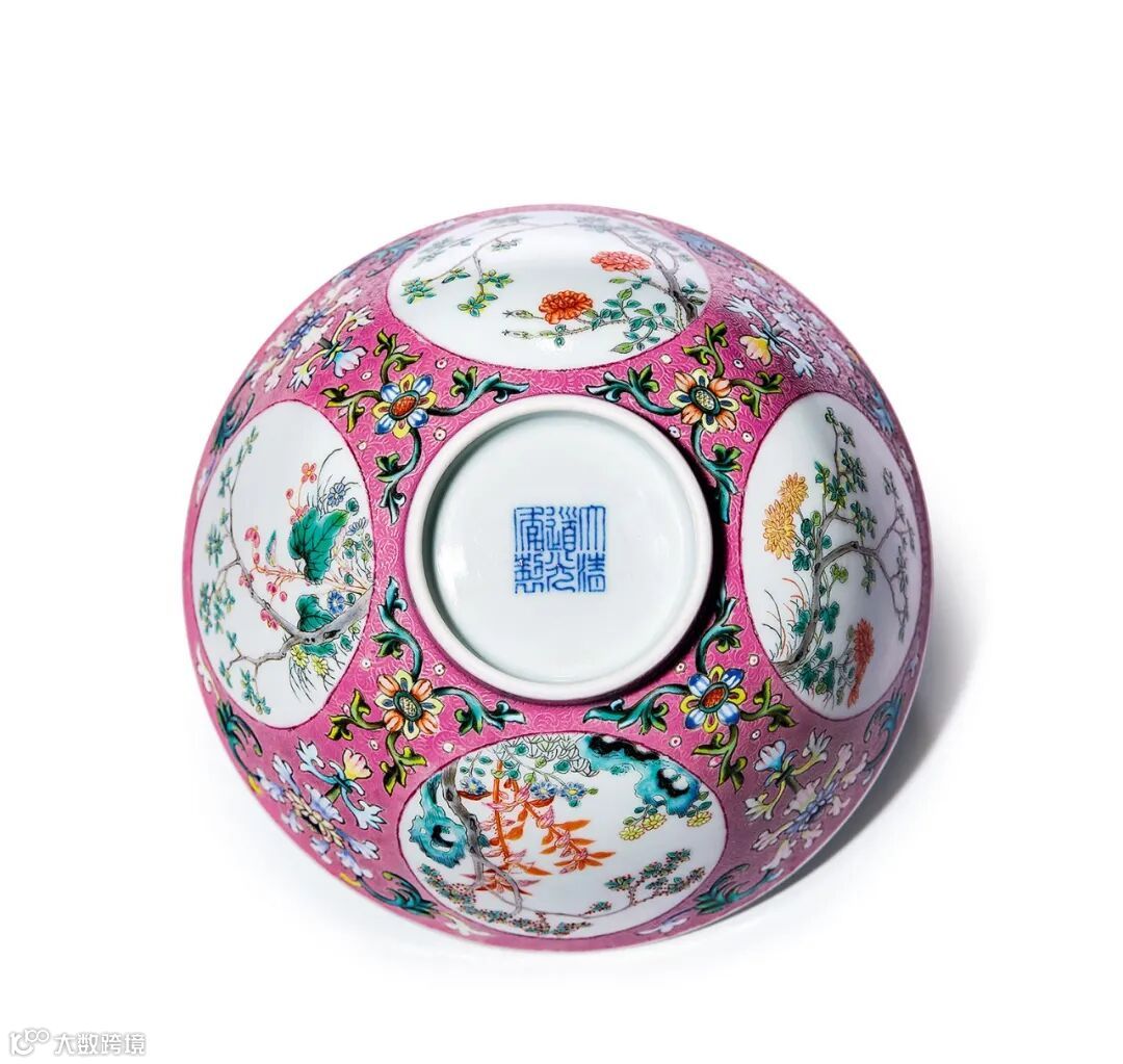LOT837清道光瓷胎粉地洋彩锦上添花开窗粉彩丹桂飘香图碗(底部图)