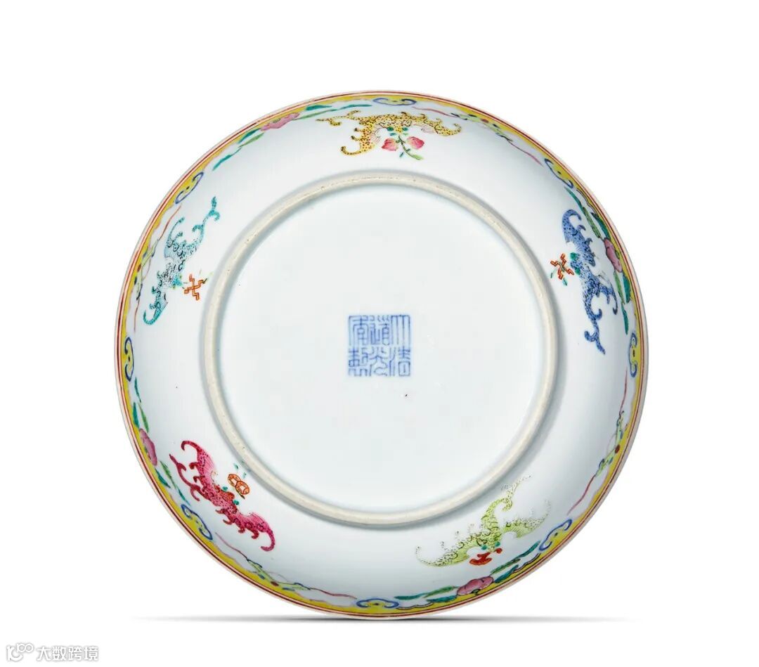 盘口沿以金彩装饰,外壁五色蝙蝠衔灵芝、寿桃、双钱及金彩万字和盘心矾红彩团寿纹共同组成五福捧寿之意,系清宫典型祝寿用器。