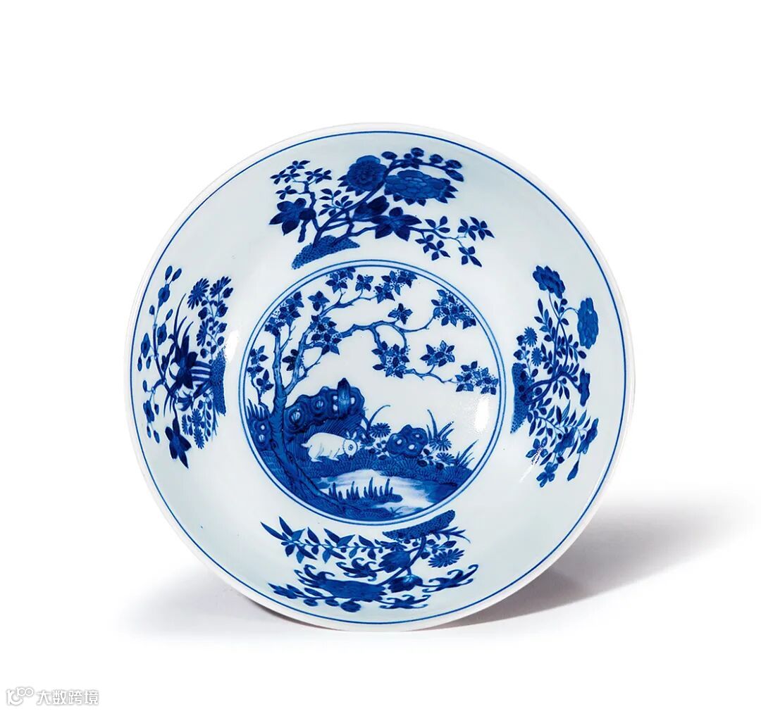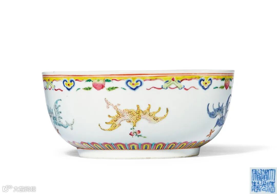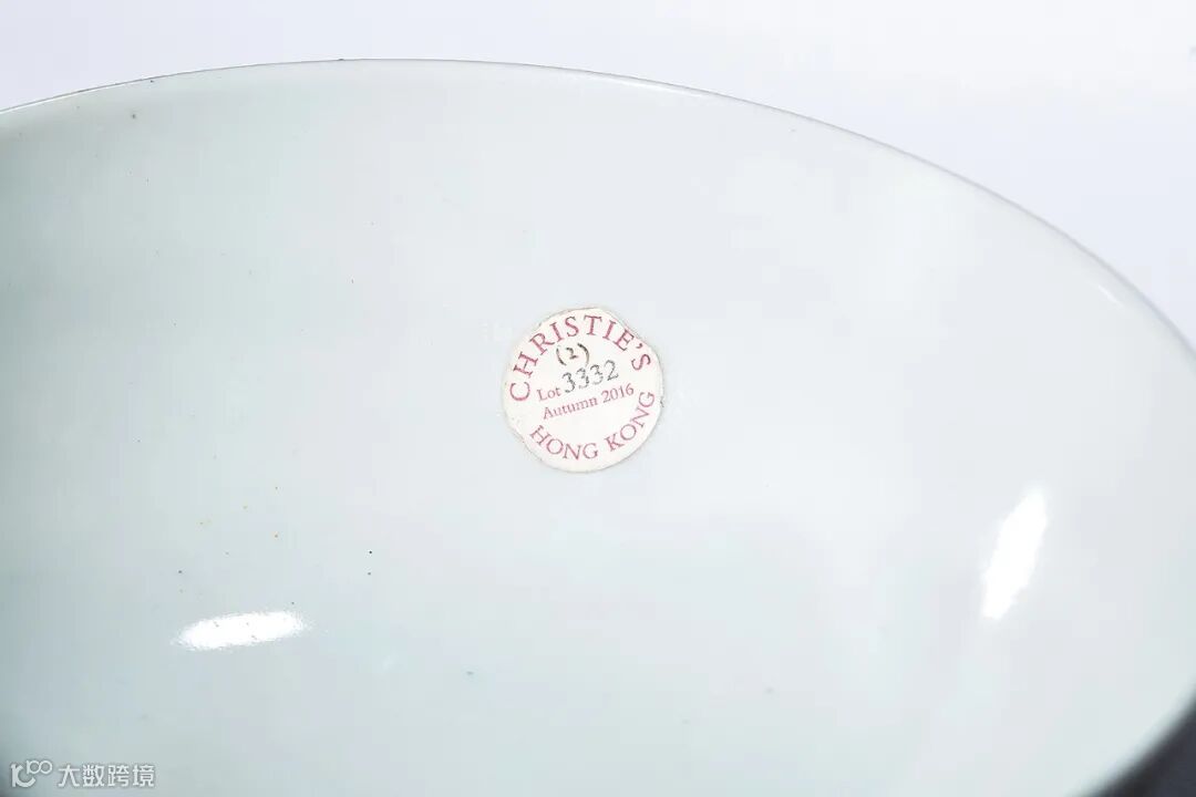 拍品品种与故宫博物院藏品相同,外壁以粉红彩轧道卷草为地,上绘粉彩西洋花卉,四组圆形开光内分别以金桂搭配月季、秋海棠、菊花、雁来红;碗内则以青花为饰,碗心绘一隻玉兔蹲于桂花树下,内壁饰芙蓉、秋葵、海棠等中秋节的时令花卉。