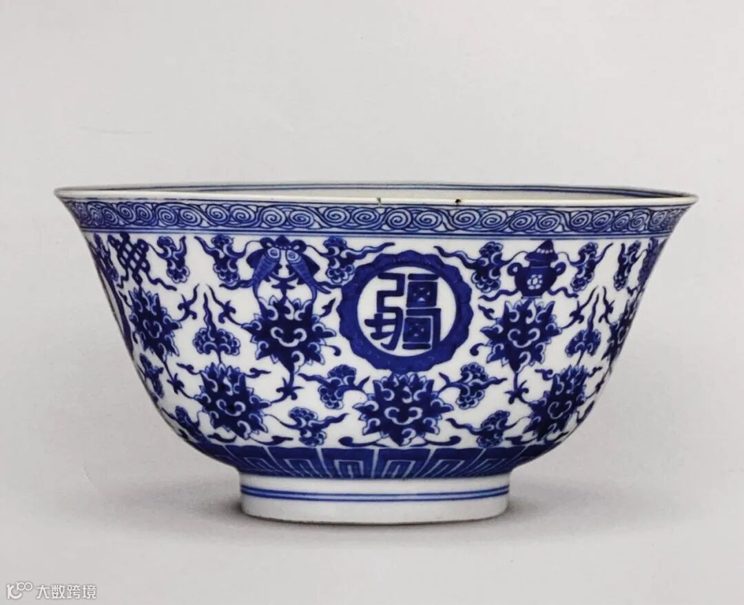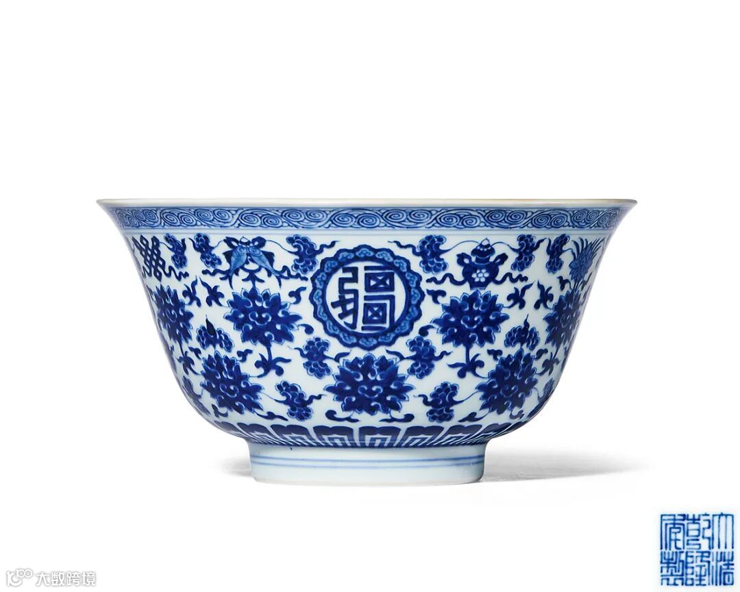 青花万寿无疆纹碗为清代官窑传统品种,所见多为乾隆朝制器,道光时期较为少见。拍品品种与台北故宫博物院藏品相同,内外壁以青花为饰,外壁主题纹饰满绘缠枝莲,上下错落,分别托八吉祥和如意头边圆形开光,开光内篆书“万寿无疆”四字,具有富贵长寿的吉祥寓意;碗心纹饰布局疏朗,绘八吉祥捧团寿纹。青花发色浓郁鲜艳,纹饰精巧细腻,为道光官窑精品。