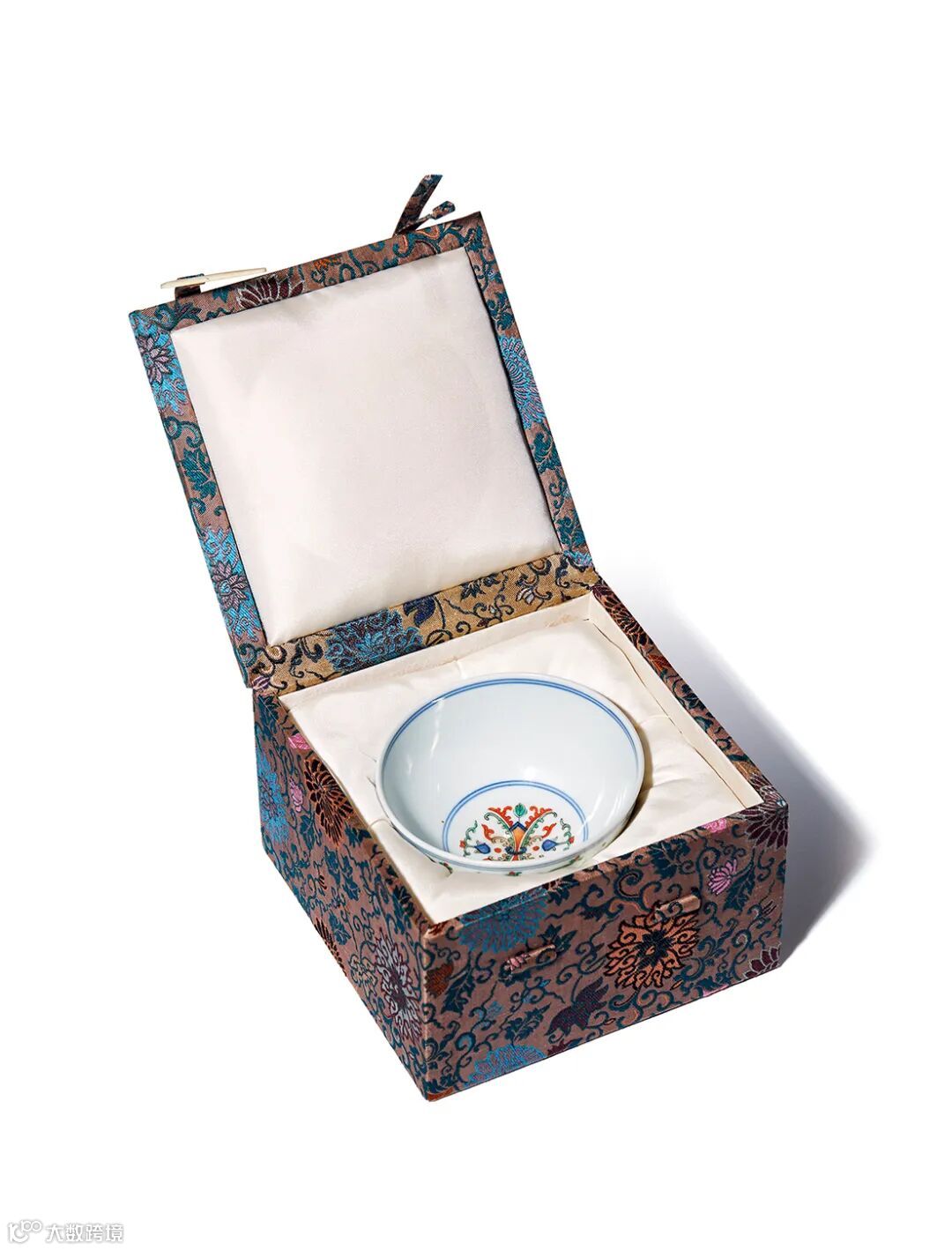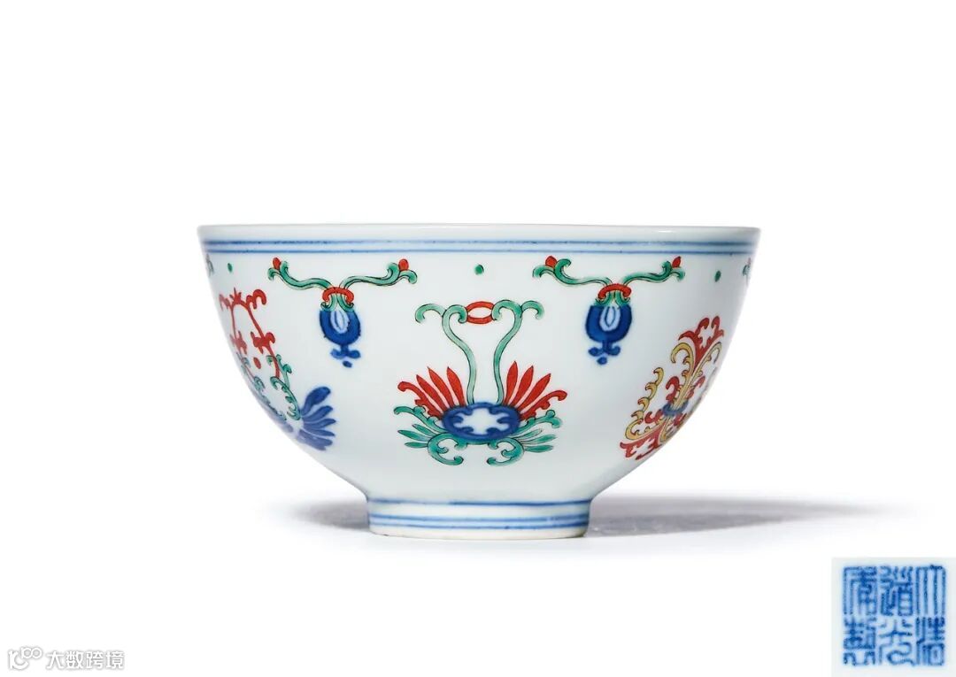 拍品撇口弧腹,下承圈足。造型秀丽端庄,盈盈而立,外壁以斗彩为饰,绘斗彩忍冬纹及贯套纹,取连绵不断之意,忍冬纹是古代瓷器上常见的一种装饰纹样,其又名双花、二宝花、鹭鹚花等,为一种多年生藤本灌木,常用中药之一。《神农本草经》把其列为上品,《本草纲目》称道其可以“久服轻身,长年益寿”。具有延年益寿的吉祥含义。此茶圆填绘细腻,制作精良,为道光官窑之典型作品,底书“大清道光年制”六字三行篆书款。