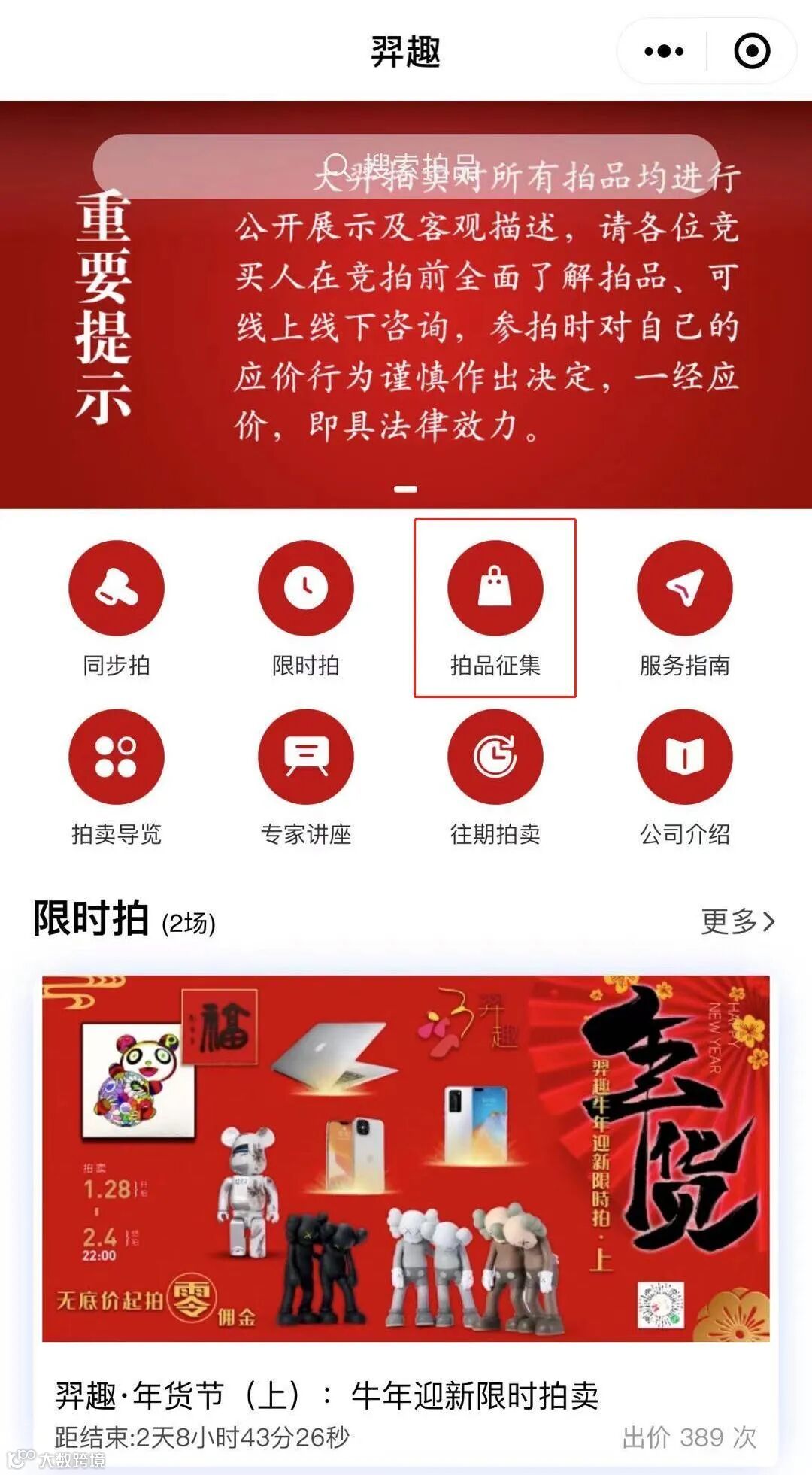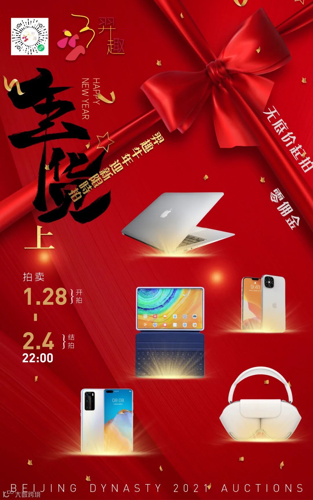 为了打破各位对拍卖行的固有印象,是富人才玩的起的游戏,动辄就要花费上千万上亿的大买卖。因此在2021年新春之际我们推出了适用于广大群众的拍卖会“羿趣·年货节”,拍品皆是日常会用到的手机、平板、笔记本电脑和电子手表什么的。还有近两年令人着迷的潮玩艺术品和迎合节日气氛的名人手写的福字和对联儿!也有令人爱不释手的当红奢侈品。