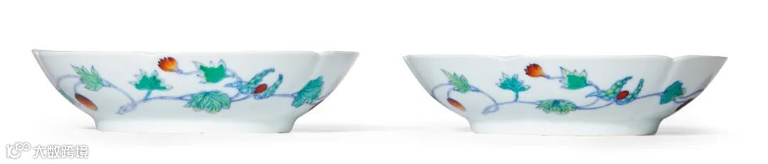 雍正斗彩素以施彩鲜丽,绘画精巧,风格清新温婉而著称于世。正如清末许之衡《饮流斋说瓷》赞曰“(斗彩)康雍至精,若人物、若花卉、若鸟兽,均异采发越、清雅可爱……足为清供雅品,弥可宝贵也。”而此对斗彩花口盘,颇为符合“异彩发越,清雅可爱”这一气质。