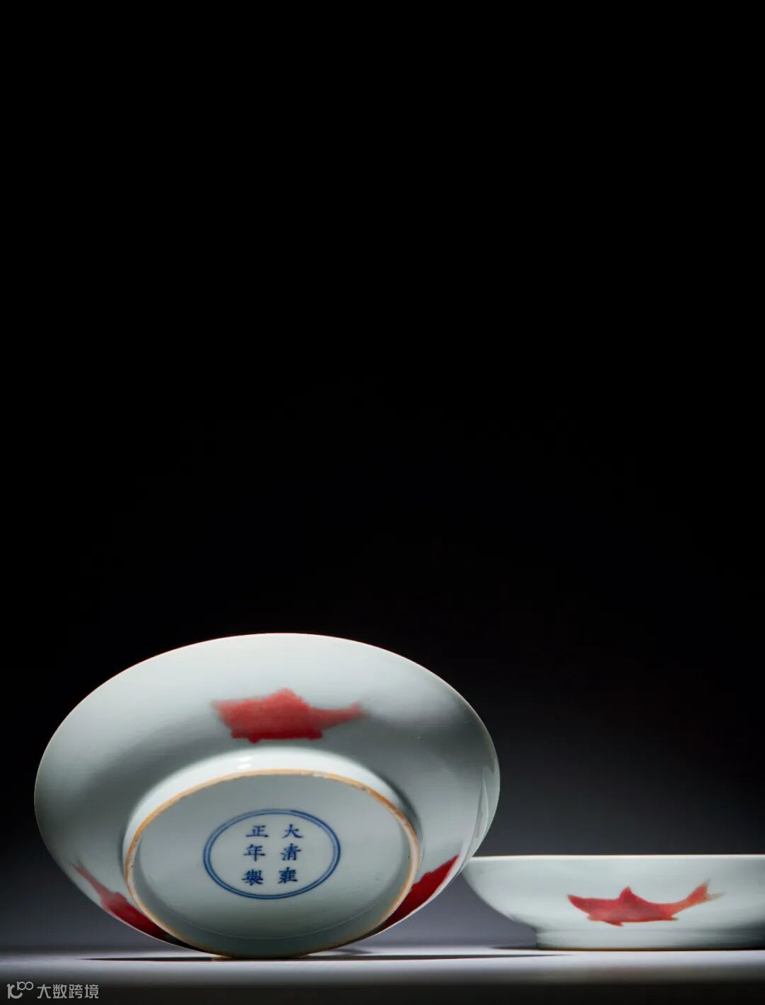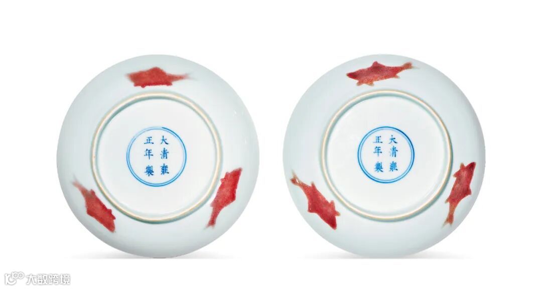 这对盘是清雍正官窑仿前官窑的名贵品种,关于此式三鱼纹的烧造,唐英在《陶成纪事碑》中有明确记载:「……一仿宣窑宝烧,有三鱼、三果、三芝、五蝠四种」,本对盘即为这种「三鱼」之代表。而此种釉里红製法承袭自永宣御窑,所饰铜红釉,或夹施于透明釉层之间,异于常见之釉下铜红彩绘技艺。此法若成,所得红色更显强烈,虽无法呈递纹样细节,具有天然红宝石般光泽,最适凸显剪影视效,文献称之为「釉里红宝烧」,为雍正御瓷中仿古佳製,彰显其品味之逸雅绝尘。