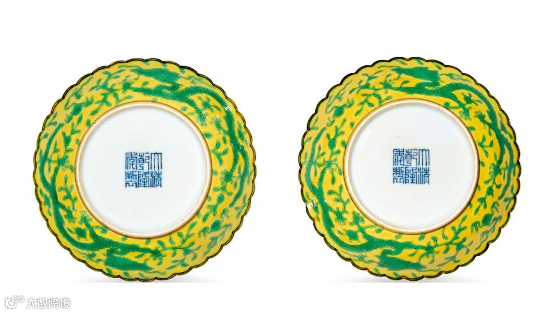 此对拍品花口,浅弧腹,圈足。盘口沿及盘心以青花双线勾边,在黄釉下呈紫黑色,通体纹饰先于胎体之上暗刻线条,再施黄绿彩装饰而成。盘心绘正面立龙戏珠纹,内外壁饰以双龙赶珠,四周花枝点缀。盘底青花书『大清乾隆年製』六字三行篆书款。此形製创始于康熙时期,据《国朝宫史》记载,黄地绿彩为贵妃所用铺宫瓷。除本品外壁装饰双龙赶珠外,也有绘饰折枝花卉纹样者。《清档》所载黄地绿龙葵瓣四寸碟即为此物。