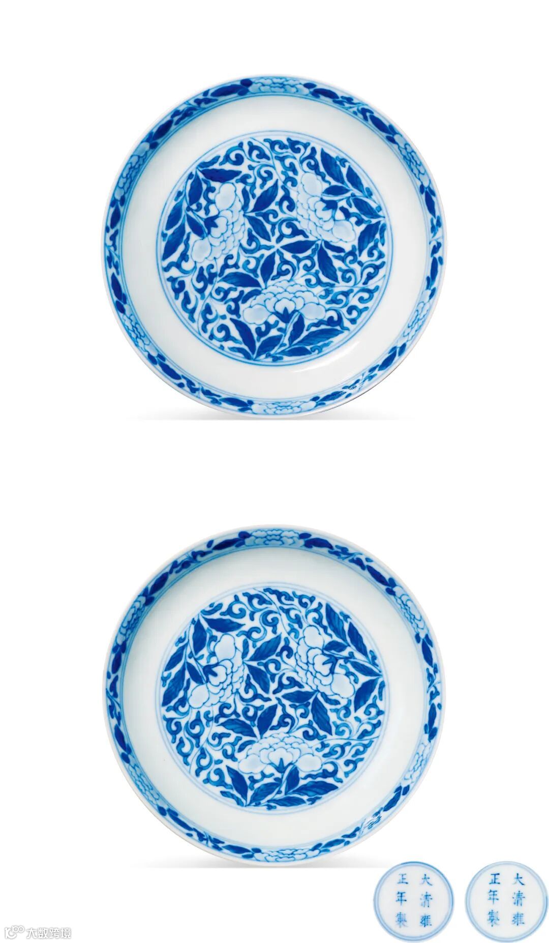 此对拍品撇口,浅弧腹,圈足。形制小巧隽秀,通体以青花为饰,盘心、外壁遍绘缠枝花卉纹,花朵娇妍,枝蔓卷曲。纹饰繁而不乱,笔触工饬流畅,青花发色雅致。此对拍品胎质精细,釉面光滑莹润,极具玻璃质感。成对传世,较为少见。