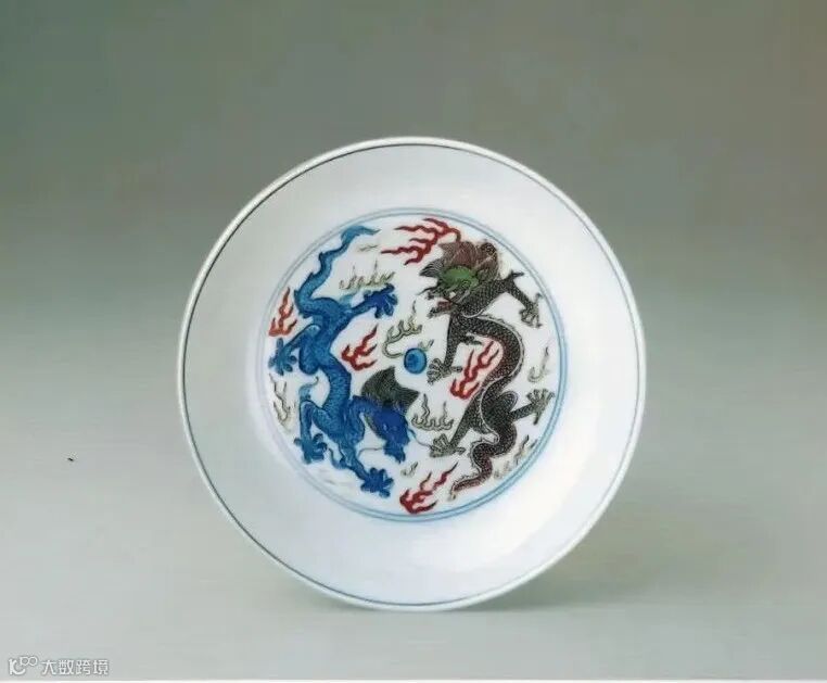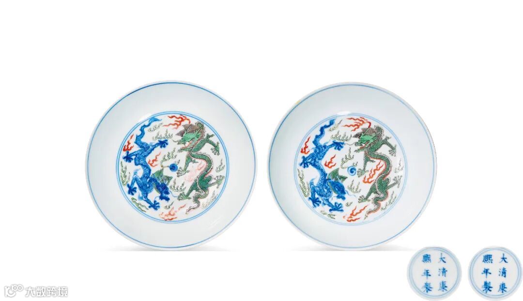 此对盘敞口,弧壁,圈足。盘心双圈内绘双龙戏珠图,双龙叱口突目,长髯飘拂,不怒自威,气势磅礡。外壁以斗彩工艺绘云鹤纹,采用“点彩”技法,仅以一星红彩点于鹤头。仙鹤于五彩祥云间飞舞,凌霄直上,仙姿迭现,一派轻灵秀逸之韵。整器别致,苍古、雅逸兼具共存,悦目怡情,沁人心扉。底部青花双圈楷书“大清康熙年制”双行六字款。