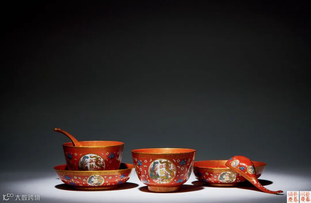 LOT851 清同治 珊瑚红地描金开光粉彩龙凤喜字纹盘、碗、匙一套六件(局部)