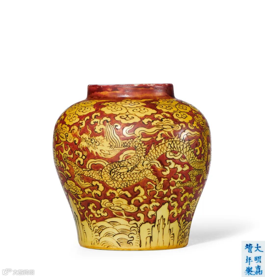 左图:明嘉靖 红地黄彩云龙纹罐(北京故宫博物院藏)