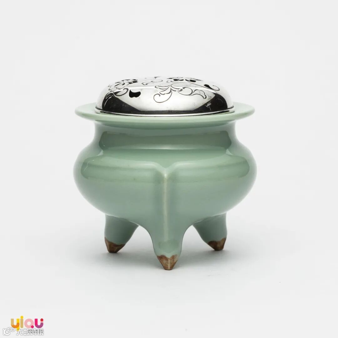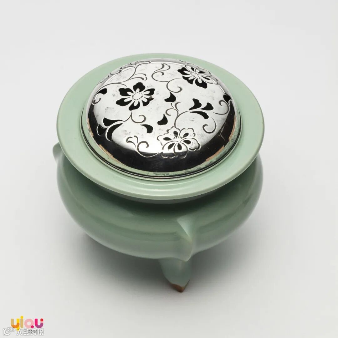 昭和早期 银盖镂空花草纹 青瓷香炉