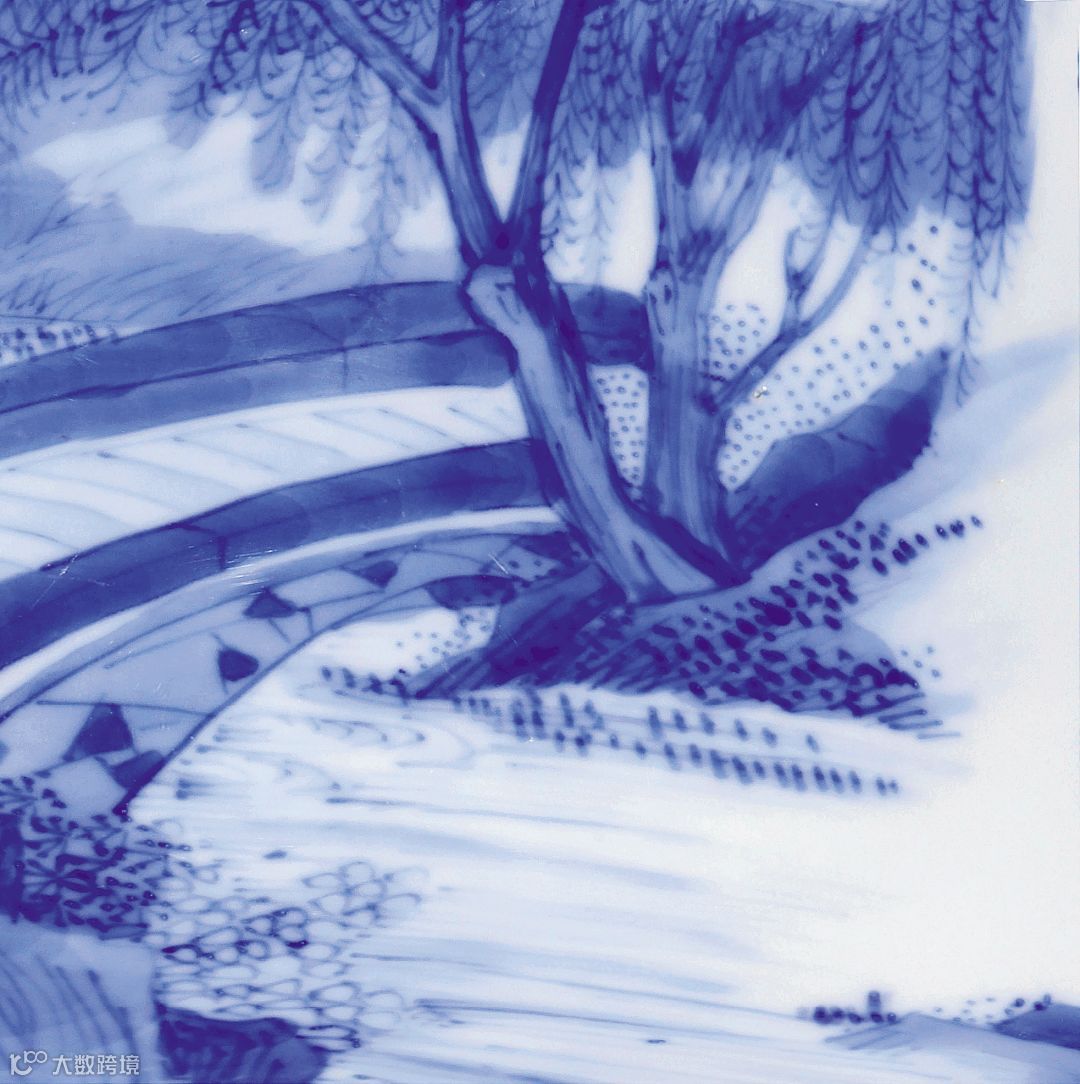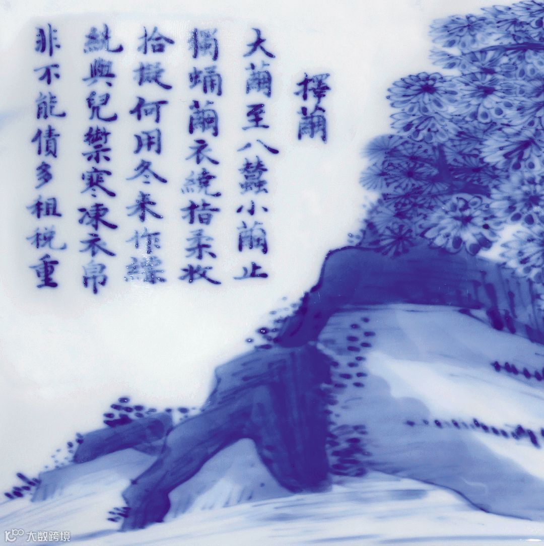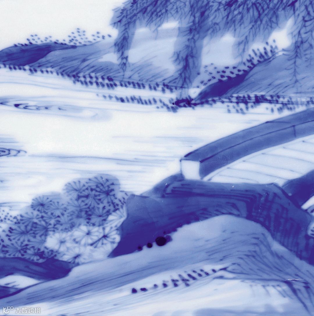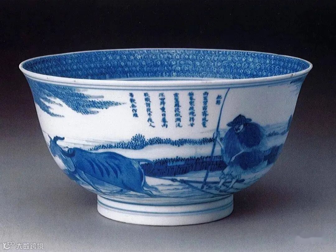 《御制耕织全图》整体借鉴了西洋透视法,远近分明,层次丰富;而康熙青花所特有的绘画技法,恰好能使焦氏的作品在瓷器上得到完美的体现。碗外壁描绘农夫在田间耕地的情景,布局严谨,用彩绘浓淡有致,充分再现了纤陌、山岭起伏之感。