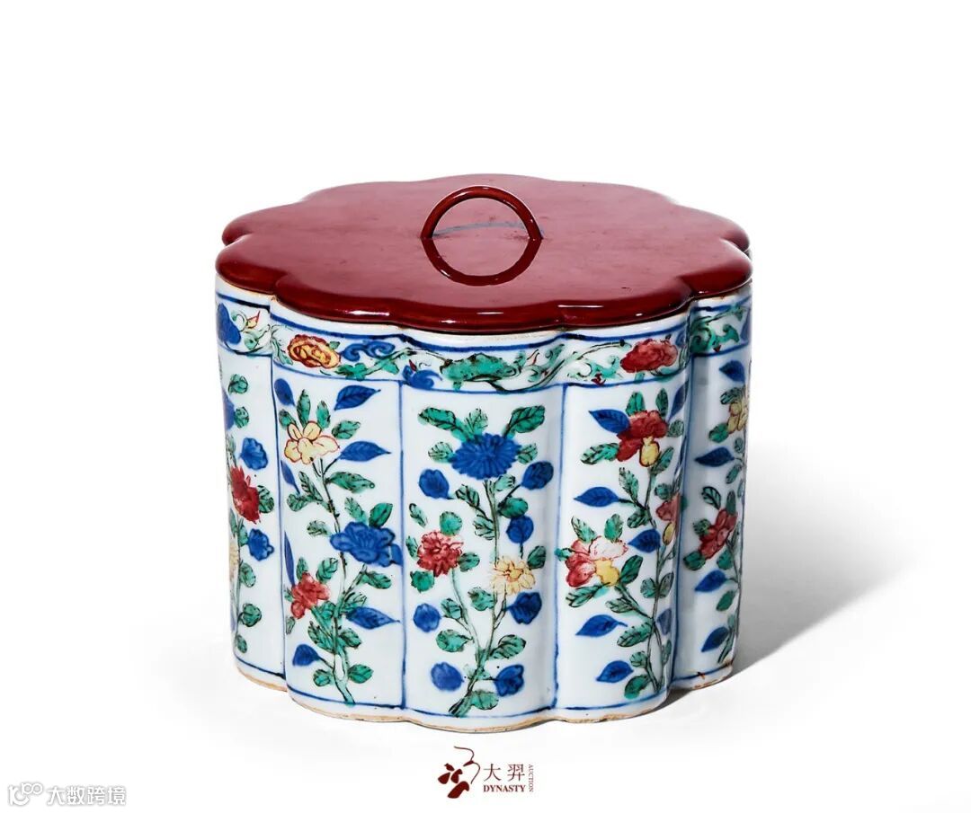 罐体呈花口状,直腹,内白釉光素,外壁以五彩作绘,每一棱面画折枝花卉纹,釉面润泽,青花发色浓重,与釉上彩料搭配和谐,红、绿、黄诸色鲜艳亮丽,诚为万曆五彩之名品。棱间以青花单线为隔,与口沿处的双青花弦线构成外框。整器造型敦厚,施彩鲜亮,花枝生动。万曆五彩一向为五彩器中的名品,为国内外藏家珍重。
