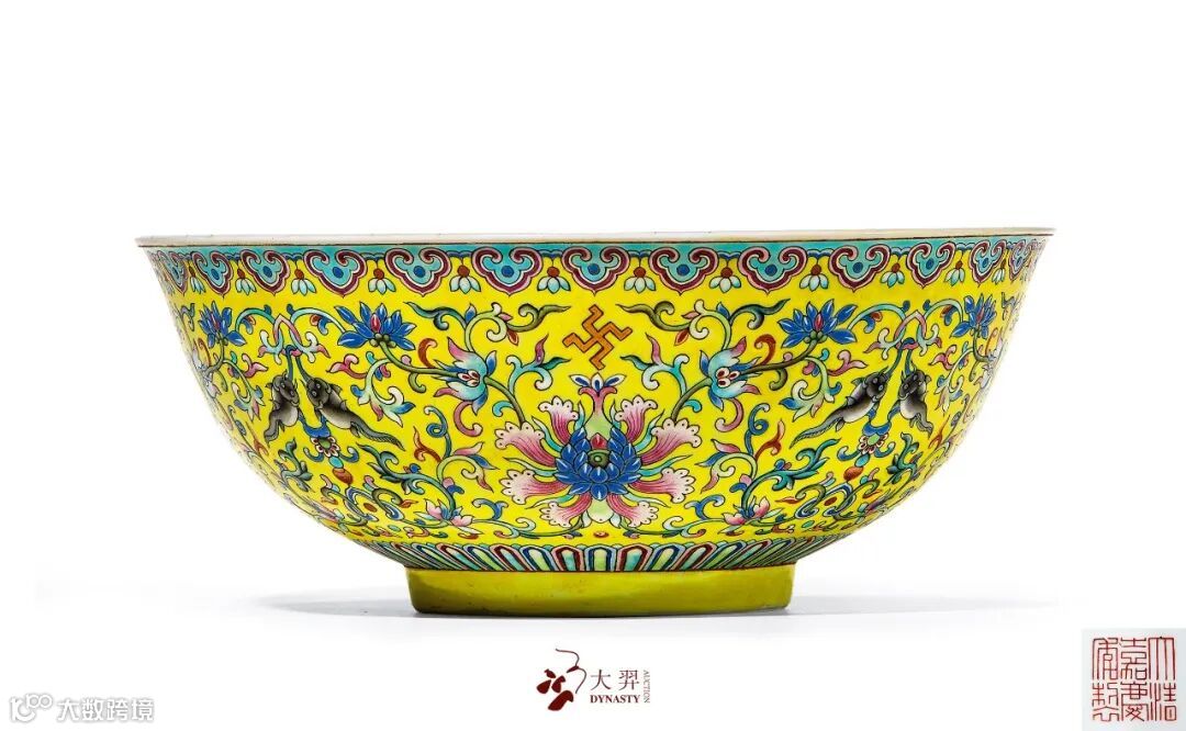 拍品胎质洁白细腻,敞口、深曲腹、圈足。圈足内部为白釉,中间以红彩篆体书写款识:“大清嘉庆年制”六字三行篆书款。碗外部以黄釉为地,粉彩绘满缠枝莲纹,兼以“吉庆有余”纹,色泽鲜艳丰富。嘉庆彩瓷以粉彩为主流,此碗画面繁密精细,纹饰丰富,近乎“百花不露地”,纹样规整活泼,足见工艺精妙。最难得之处,此碗纹饰布局繁缛,描绘精致,颜色配比亮丽,非常难得,为嘉庆官窑佳品。